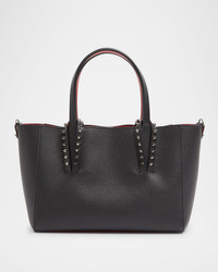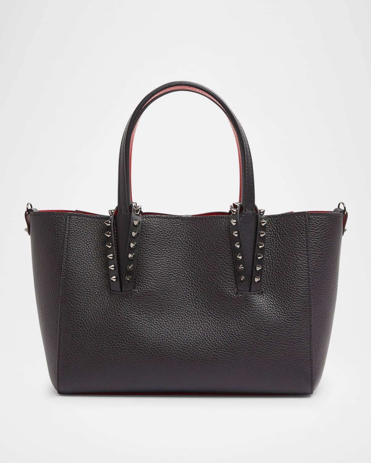 - Christian Louboutin "Cabata" soft east-west shoulder bag in grained leather - Top handles with spike trim - Detachable, adjustable web crossbody strap - Can be worn as a top handle, shoulder, or crossbody bag - Open top with lobster clasp closure - Lining: Leather - Rubber logo bottom - Approx. 6.7"H x 9.4"W x 3.9"D - Made in Spain