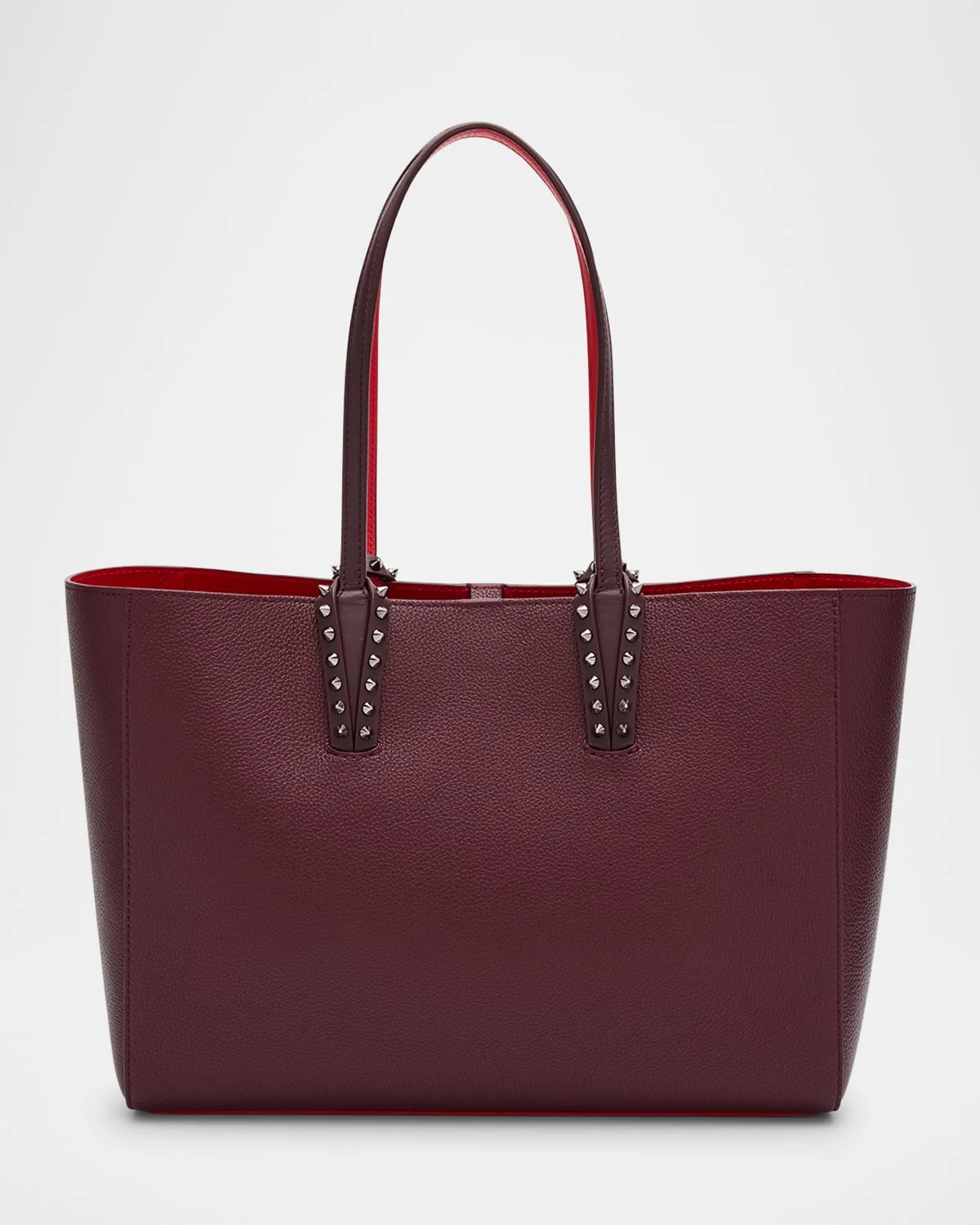 - Christian Louboutin "Cabata" soft tote bag in grained leather - Shoulder straps with spike trim - Open top with lobster clasp closure - Interior, leashed zip pouch bag - Signature red lining - Lining: Leather - Rubber logo bottom - Approx. 9.4"H x 13.4"W x 5.5"D - Made in Spain