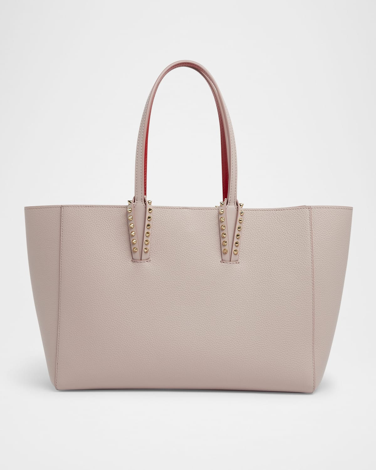 - Christian Louboutin "Cabata" soft tote bag in grained leather - Shoulder straps with spike trim - Open top with lobster clasp closure - Interior, leashed zip pouch bag - Signature red lining - Lining: Leather - Rubber logo bottom - Approx. 9.4"H x 13.4"W x 5.5"D - Made in Spain