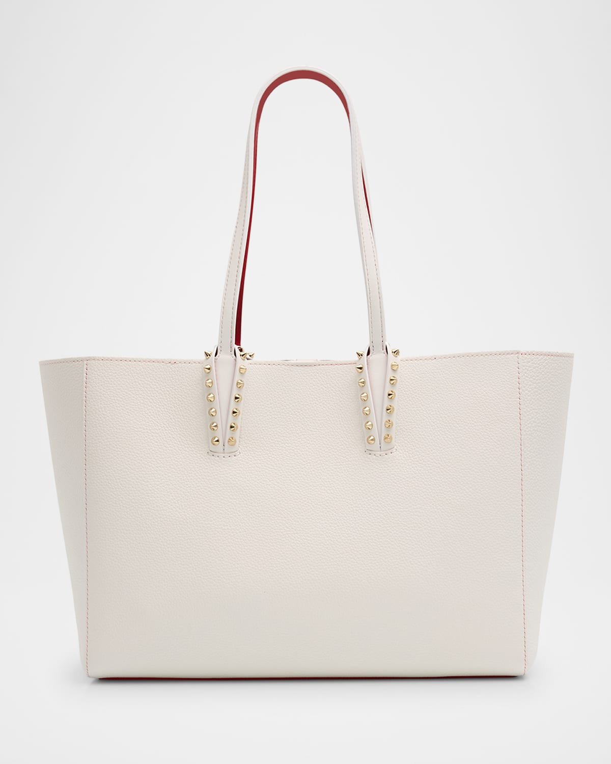 - Christian Louboutin "Cabata" soft tote bag in grained leather - Shoulder straps with spike trim - Open top with lobster clasp closure - Interior, leashed zip pouch bag - Signature red lining - Lining: Leather - Rubber logo bottom - Approx. 9.4"H x 13.4"W x 5.5"D - Made in Spain