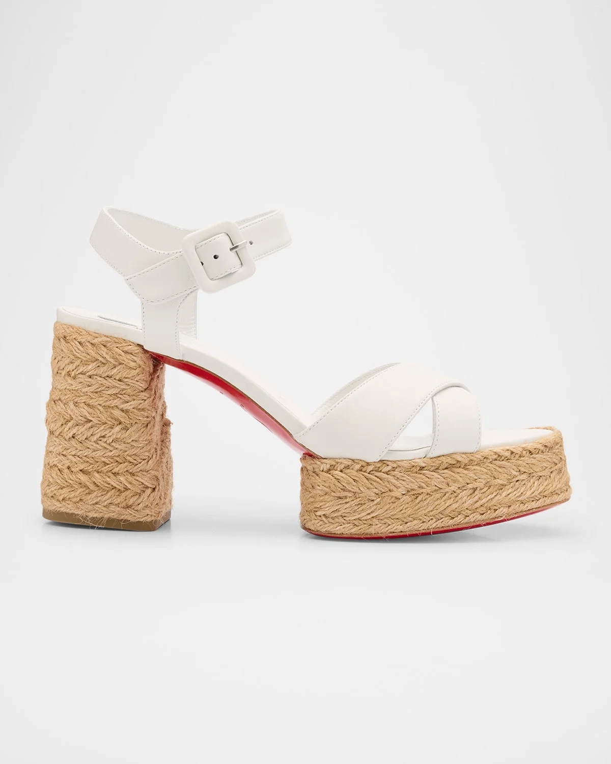 Christian Louboutin leather platform espadrille sandals 2.75 in / 70 mm braided-jute block heel Open toe Crisscross vamp Adjustable ankle strap Signature red leather outsole Made in Spain