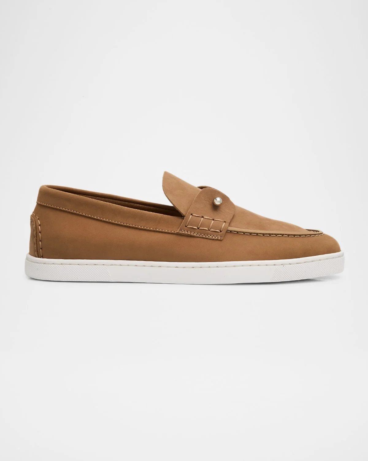 Christian Louboutin "Chambeliboat Donna" boat shoes crafted of nubuck calf leather Flat heel Round apron toe Metal collar pin Slipon style Rubber outsole Lining: Leather Made in Italy