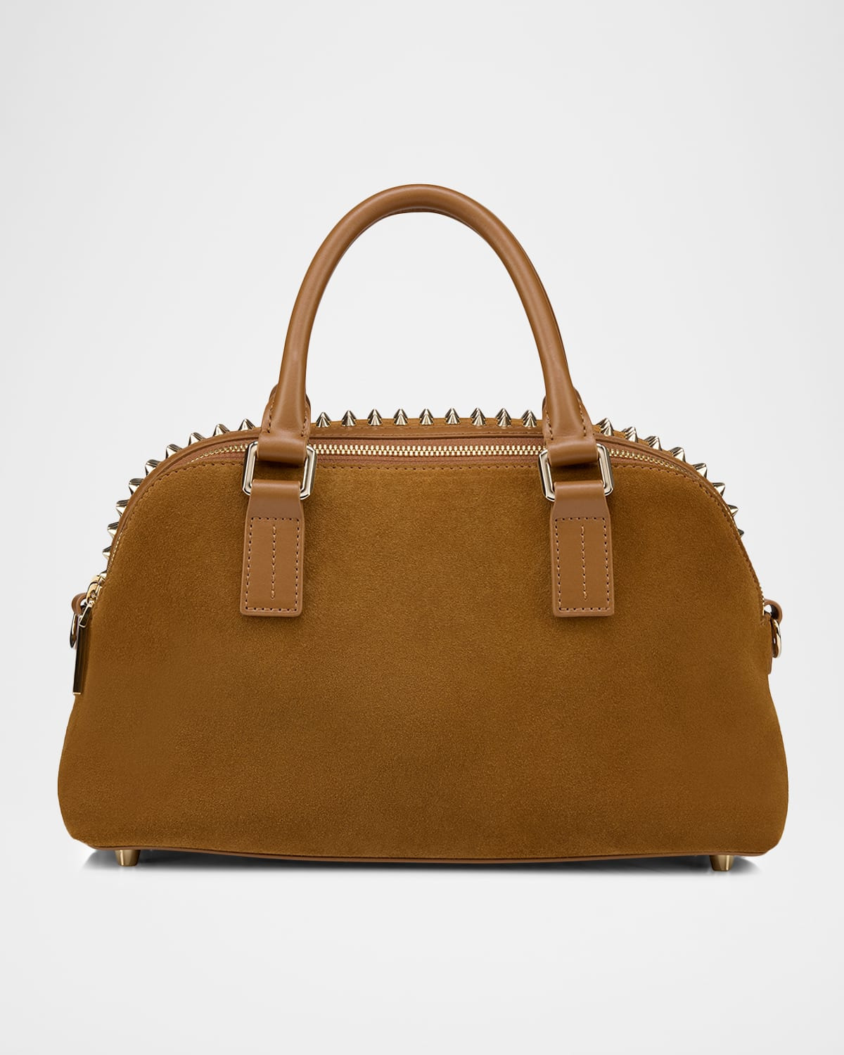 - Christian Louboutin "Funky" bowling bag in suede embellished with signature spikes - Rolled leather top handles - Detachable crossbody strap - Can be worn as a top handle or crossbody bag - Double zip top - Exterior, one zip pocket - Signature red cotton lining - Feet protect the bottom of the bag - Approx. 6.7"H x 11.4"W x 4"D - Made in Italy