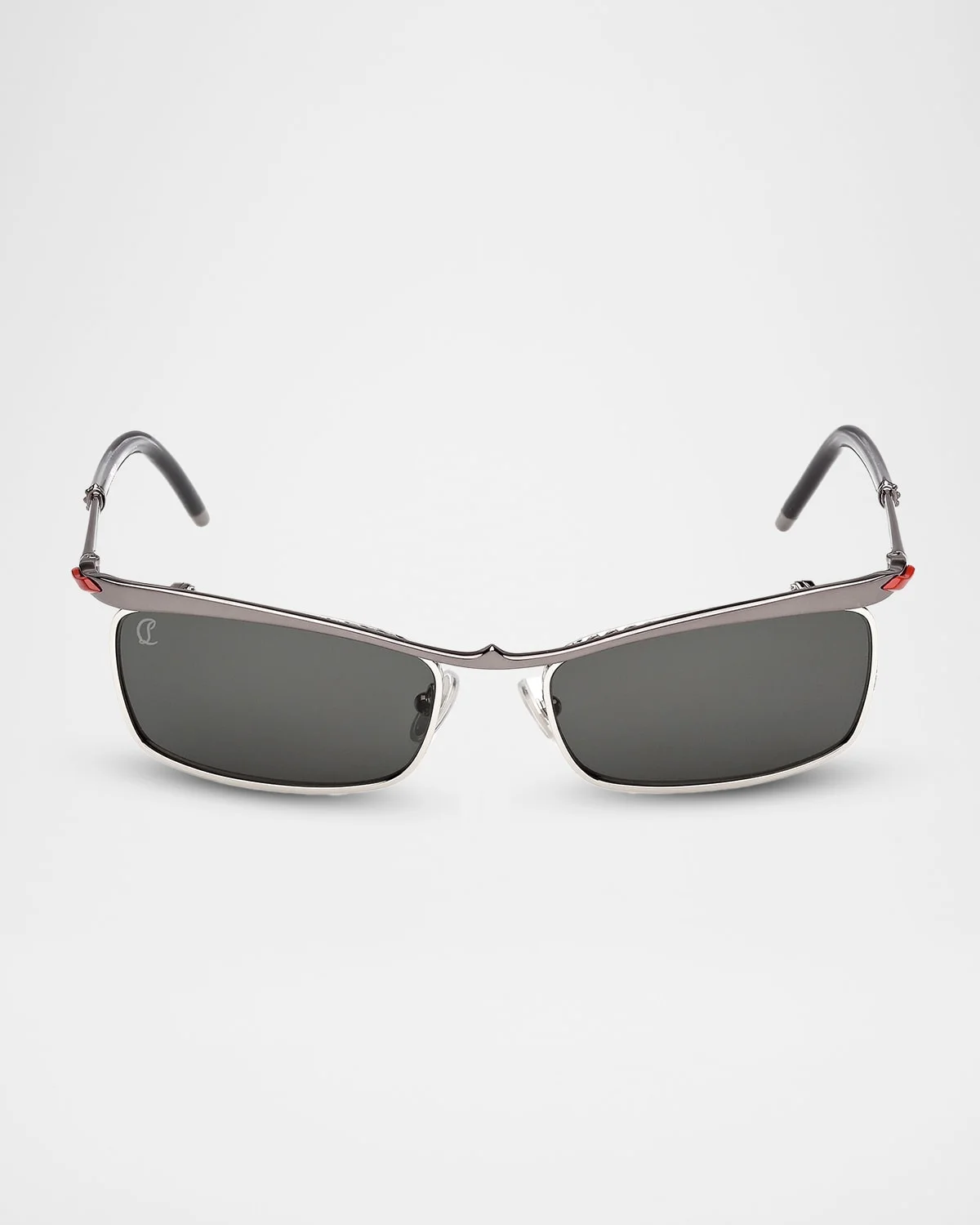 Christian Louboutin "Hot Chick" sunglasses spotlight shiny metal frames with a rectangular shape. Eye/bridge/temple (in mm): 5518135 Zeiss smokemirrored lenses Adjustable nose pads 100% UVA/UVB protection Can be fitted with prescription lenses Cleaning cloth and case included Metal Made in Italy