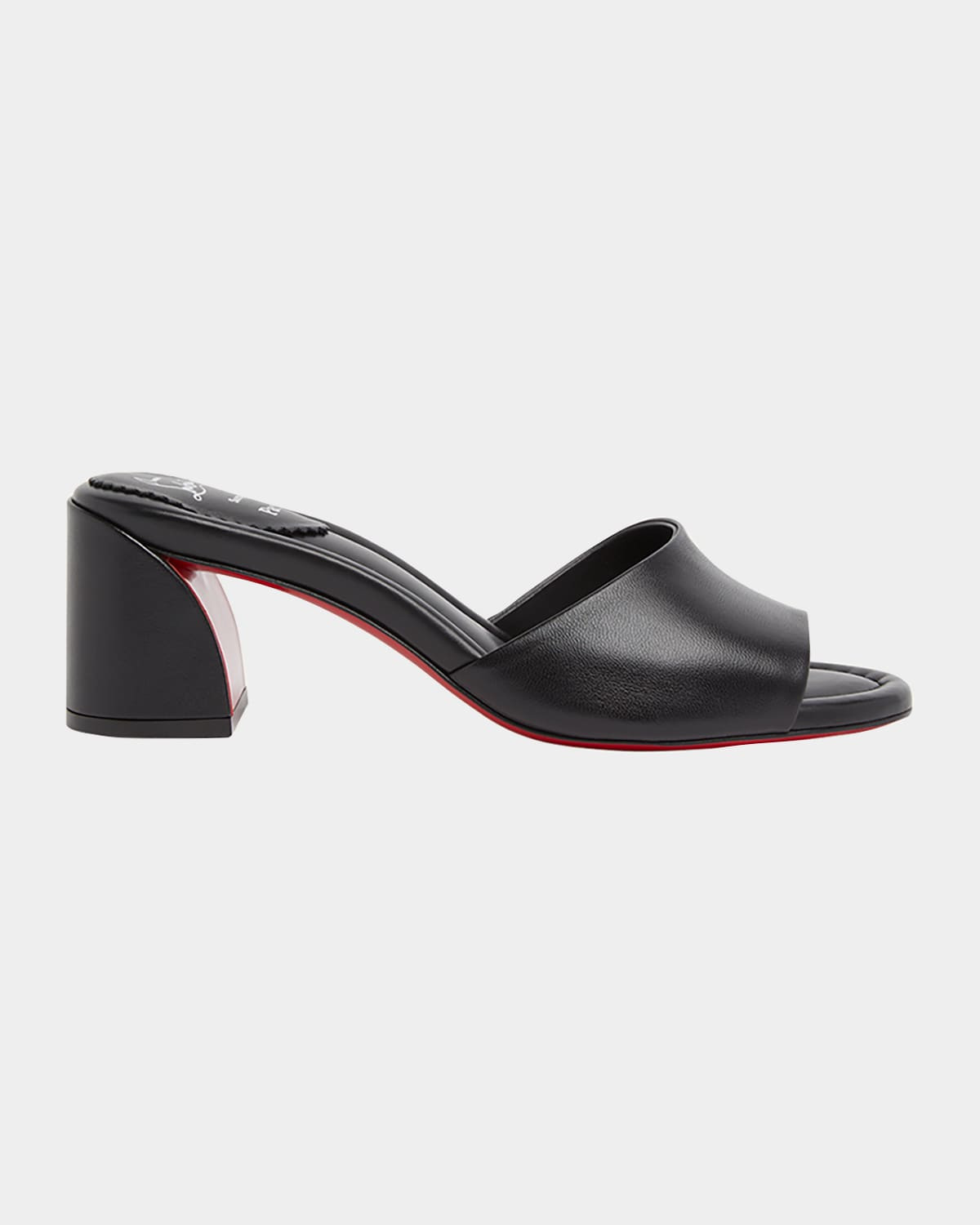 - Christian Louboutin "Jane" smooth leather mule sandals. - 2.25 in / 55 mm block heel. - Open toe. - Wide band upper. - Slide style. - Signature Louboutin red leather sole. - Lining: Leather. - Made in Italy.