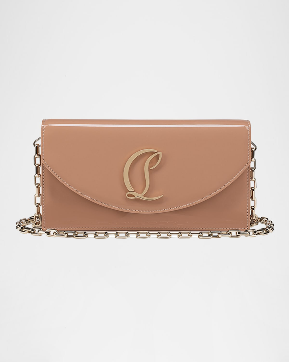 - Christian Louboutin "Loubi54" clutch bag in patent leather - Chain shoulder strap - Can be worn as a clutch or shoulder bag - Flap top with magnetic closure; CL logo accent - Interior, three card slots - Signature red lining - Approx. 4.7"H x 8.7"W x 2.2"D - Made in Italy