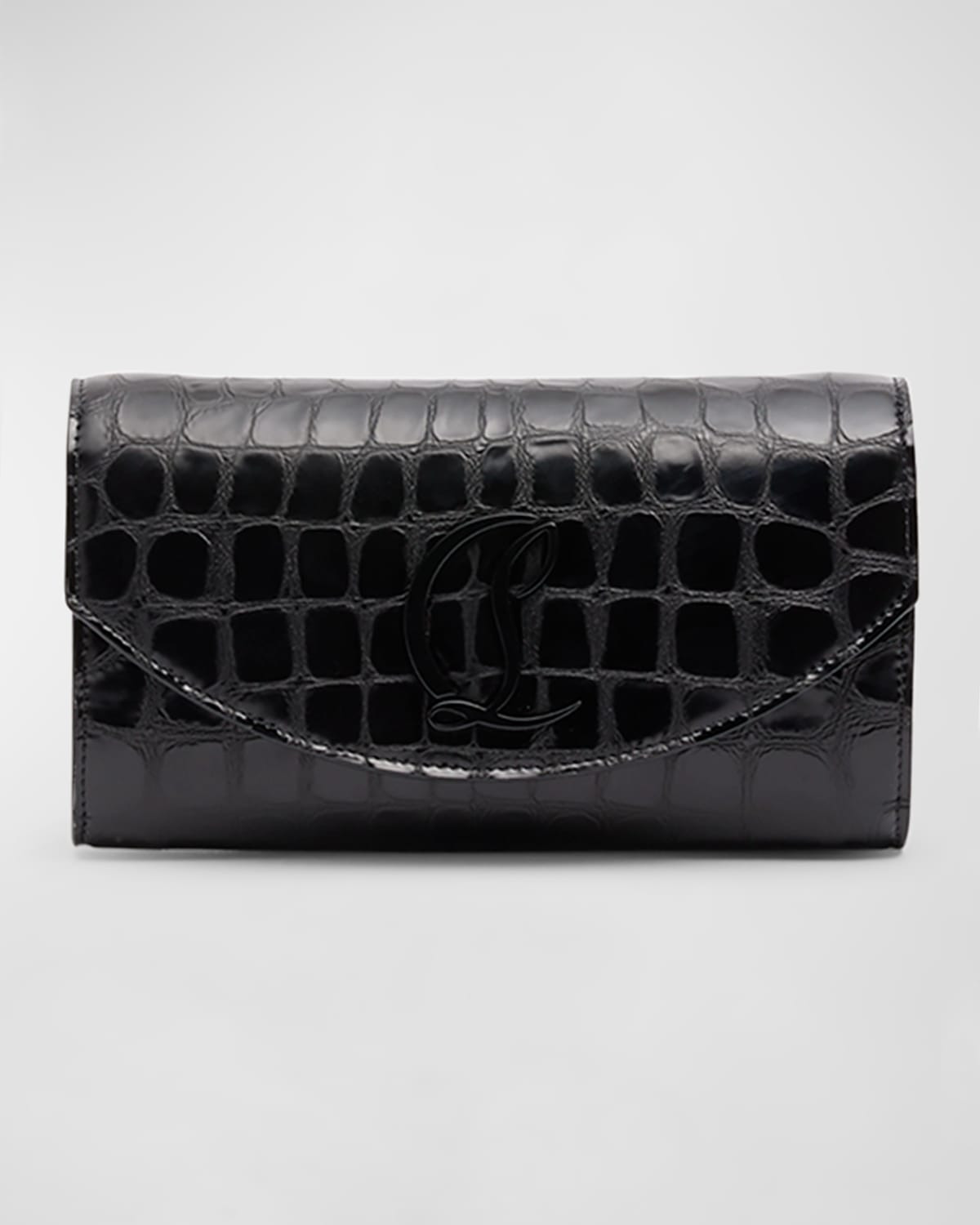 - Christian Louboutin "Loubi54" wallet in alligator-embossed leather and cotton - Detachable chain crossbody strap - Can be worn as a wallet or crossbody bag - Envelope flap top with magnetic closure - Interior, four card slots and one zip compartment - Signature red lining - Approx. 4.1"H x 4.1"W x 1.8"D - Made in Italy