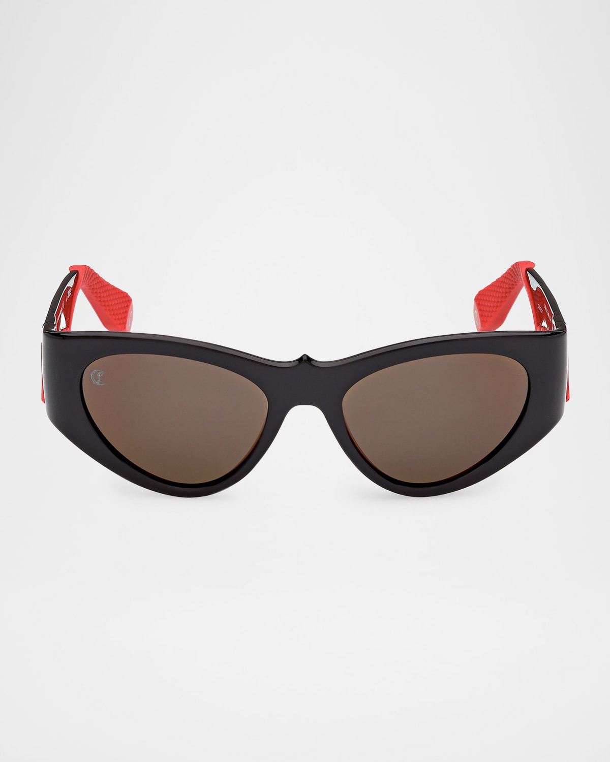 - Christian Louboutin "LB0018W" cat-eye sunglasses in acetate featuring a spike accent above the nose to effortlessly accentuate face features - Loubishark inspired temples add a touch of daring edge - Lens/bridge/temple (in mm): - 54-19-140 - Solid-color lenses - Saddle nose bridge - Signature Loubi red at the inner arms - Acetate - Spot clean - 100% UVA/UVB protection - Made in Italy - Proposition 65 warning for California residents