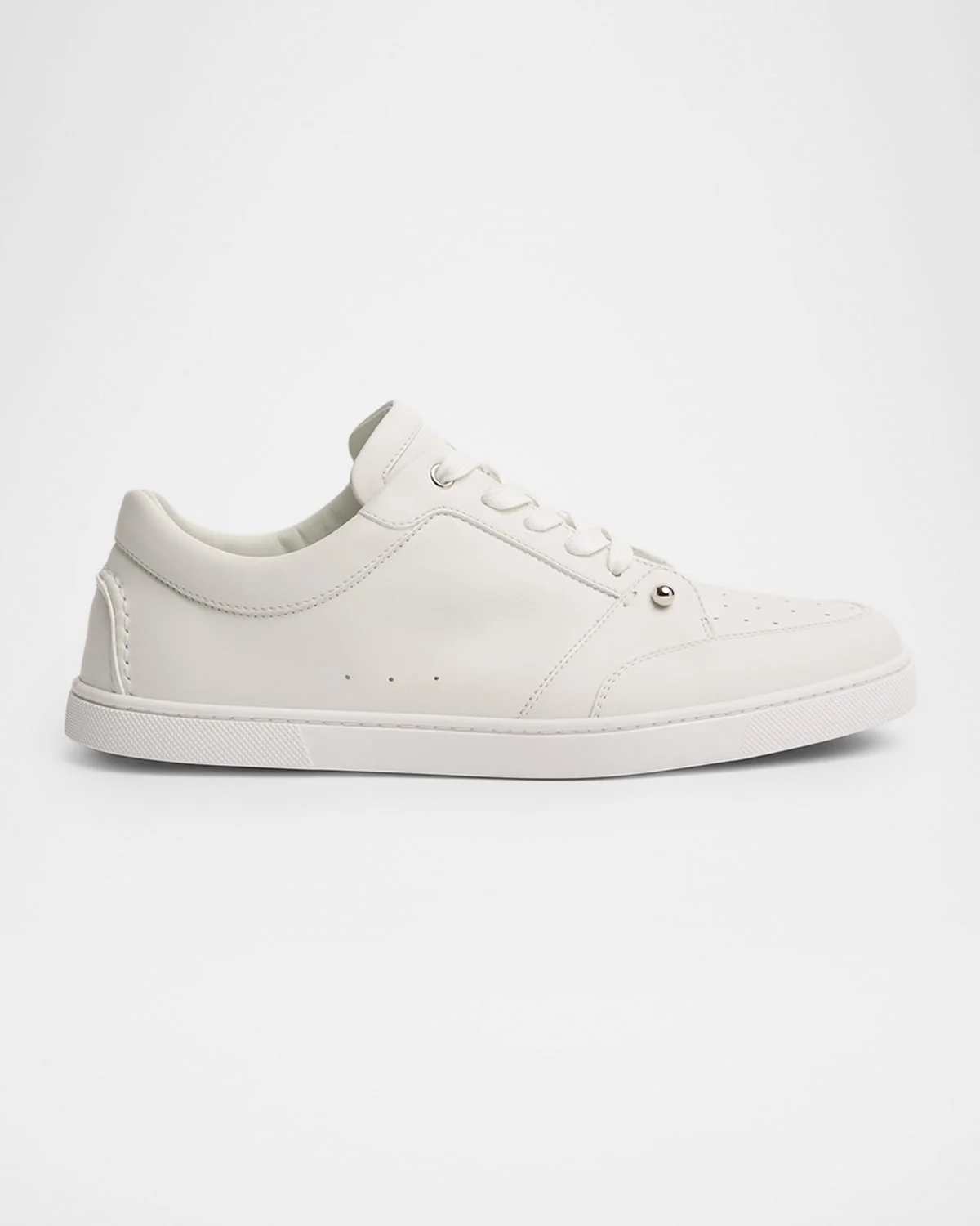 A sneaker with a slim urban silhouette, the "Chambelisneak" by Maison Christian Louboutin is crafted entirely from white, unlined calf leather. Enhanced with finishing details, it is characterized by its transverse metallic collar pin for an audacious style. Flat heel Round toe Laceup vamp Signature Loubi red rubber outsole Spot clean Made in Italy