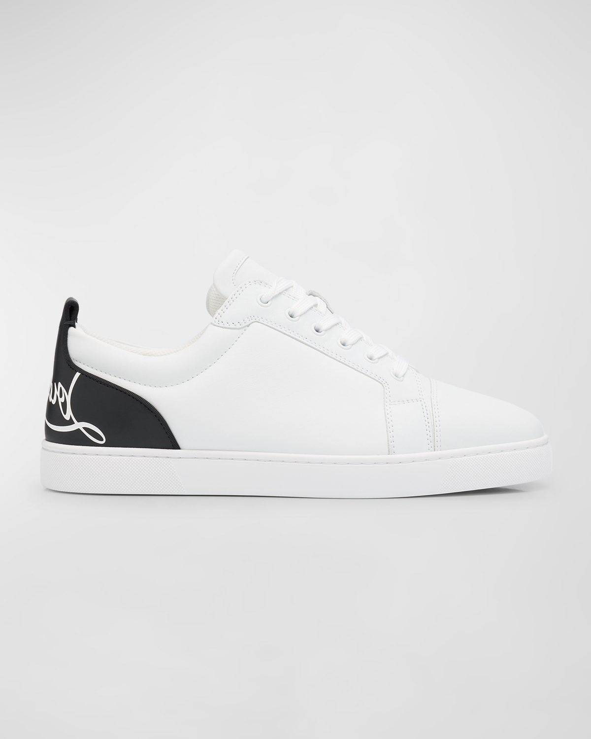 - The Fun Louis Junior low-top sneaker is inspired by the world of basketball and is set on a rubber sole. Blending elegant and sporty lines, this iconic model is entirely crafted in white calf leather with a contrasting back heel tab. It is finished with a grosgrain ribbon trim and a Maison Christian Louboutin signature at the back. - Christian Louboutin "Fun Louis Junior" calf leather low-top sneakers - Flat heel - Round cap toe - Lace-up vamp - Logo lettering at heel tab - Signature red rubber outsole - Made in Italy