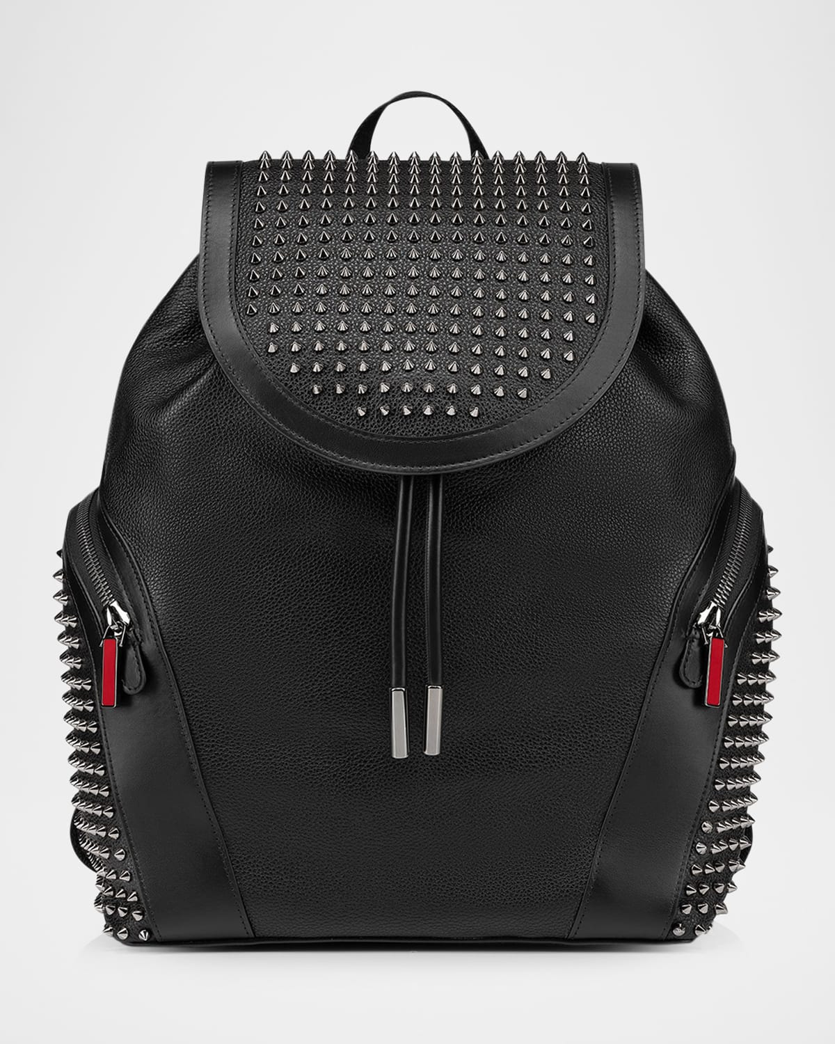 - Christian Louboutin "Funky" backpack crafted from black calf leather featuring the signature silvertone spikes for a modern style - Top handle - Adjustable monogrammed shoulder straps - Flap top; drawstring closure - Exterior, two side zip pockets - Interior, one padded laptop compartment - Loubi red lining - Mesh back panel - Approx. 17.3"H x 13.7"W x 6.2"D - Made in Italy