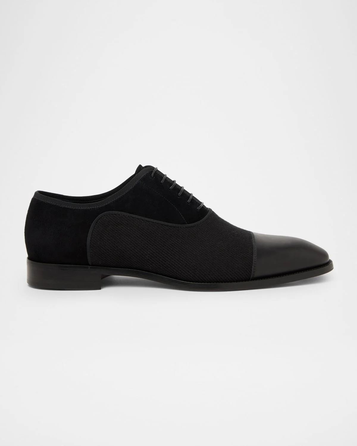 The elegant "Greggory" Oxford shoe by Christian Louboutin has a tapered silhouette crafted from black calf leather, Serge Smart fabric, and veau velours. This model features an 'Everlasting Red' sole, thanks to an innovative coating technique that ensures resistance and lasting vibrancy. Stacked heel Round leather cap toe Laceup vamp Signature Louboutin red leather outsole Lining: Fabric Made in Italy