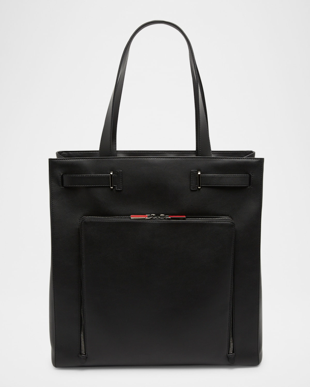 - Christian Louboutin "Kyipouch" tote bag in soft grained calf leather featuring an exterior zip cpmpartment to hold your essentials - Two flat top handles - Open top - Exterior, one front zip pocket - Interior, one center zip compartment - Signature Loubi red on the interior and zip pulls - Adjustable leather side straps - Approx. 15.16"H x 14.6"W x 4.9"D - Made in Italy