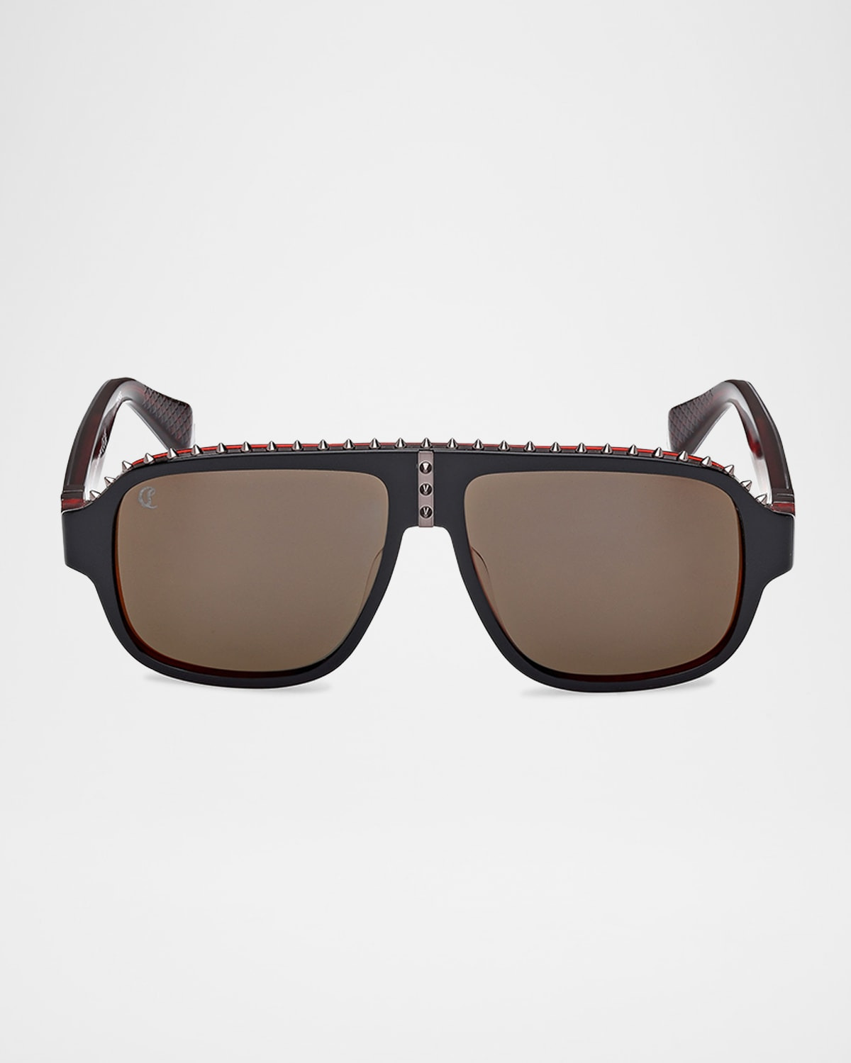 - Christian Louboutin "LB0005M" aviator sunglasses in acetate featuring a metallic studs on the top frames for a touch of daring edge - Lens/bridge/temple (in mm): - 57-13-140 - Solid-color lenses - Monogram on the right lens - Saddle nose bridge - Tapered arms - Acetate - Spot clean - 100% UVA/UVB protection - Made in Italy - Proposition 65 warning for California residents