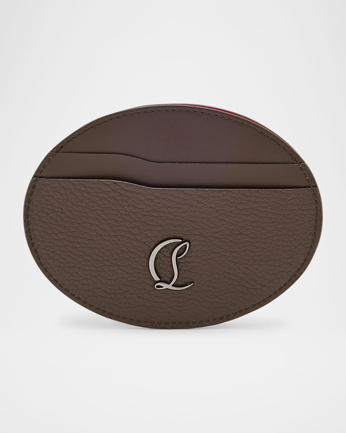 - Christian Louboutin oval-shaped card holder in smooth and grained calf leather - Mooncrest monogram on the front - Embossed signature on the back - Signature Loubi red interior - Four card slots - One central compartment - Approx. 3.5"H x 4.7"W x 0.2"D - Made in Italy