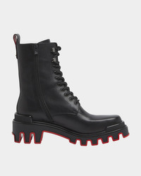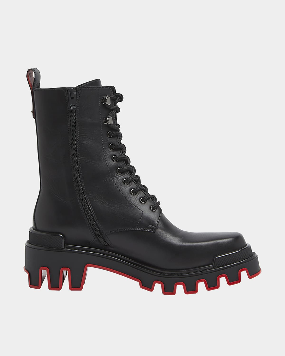 - Christian Louboutin "Trott Dune" combat boots in calf leather - Chunky heel - Round toe - Lace-up vamp - Leather lining - Backstay pull tab with single spike - Chunky lug sole with signature Loubi red outline - Made in Italy