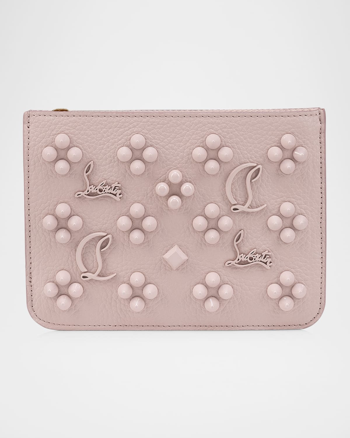 - Christian Louboutin "Paloma" leather card holder with signature Loubinthesky studs - Zip top closure - Exterior, one slip pocket and four card slots - Interior, chain leash strap - Signature red lining - Lining: Cotton - Approx. 3.5"H x 5.1"W - Made in Italy