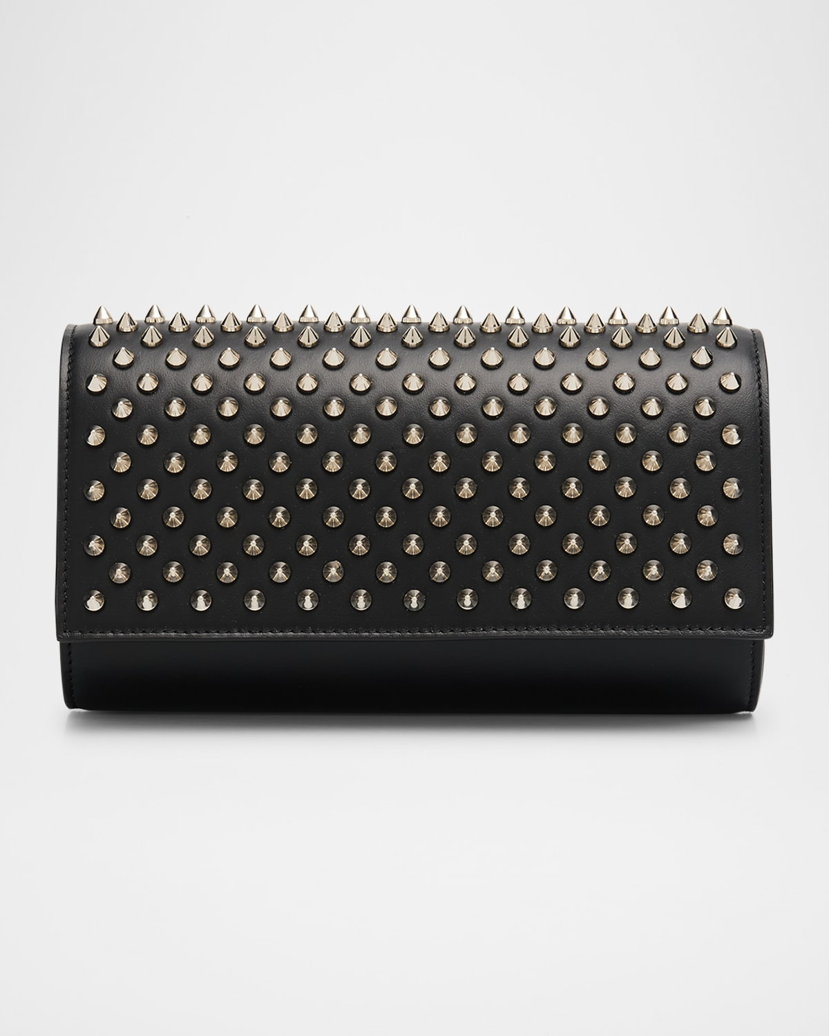 - Christian Louboutin "Paloma" wallet in leather with spike studs - Detachable shoulder strap - Can be worn as a wallet, clutch, or shoulder bag - Flap top with magnetic closure - Center zip compartment divides interior; card slots - Signature red lining - Approx. 4.1"H x 7.5"W x 1.8"D - Made in Italy