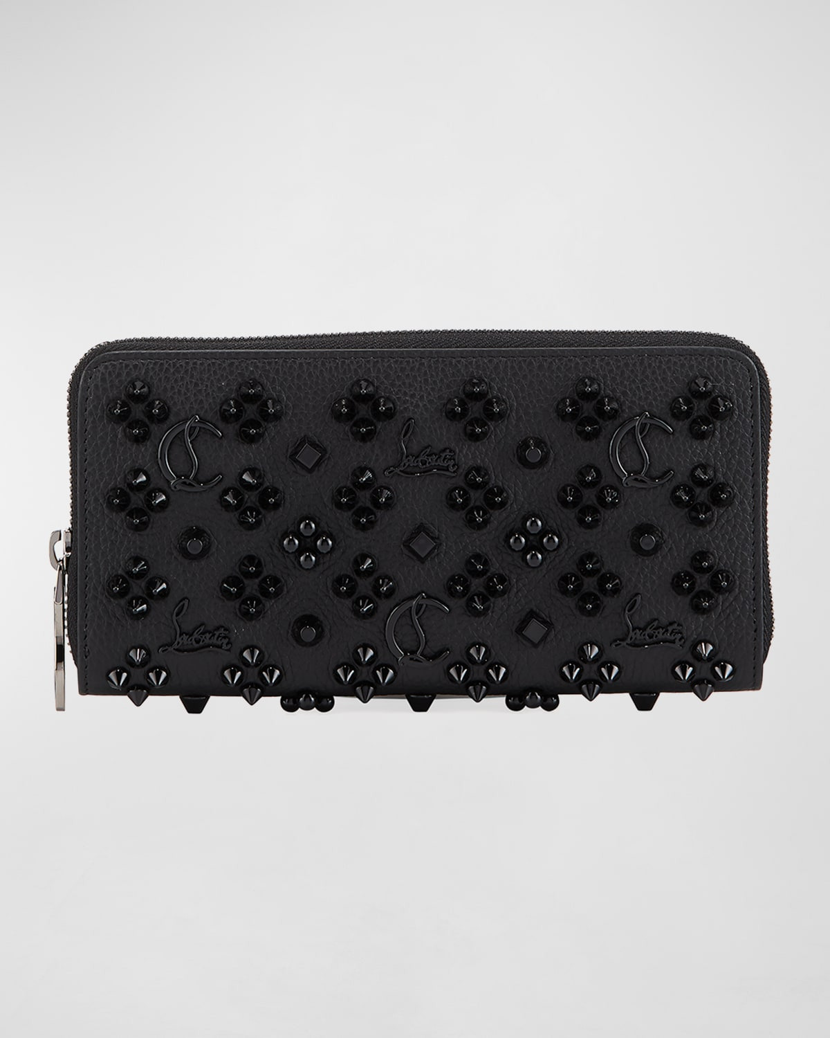 - Christian Louboutin "Panettone" studded leather wallet with logo details. - Zip-around top with red sole zip pull. - Inside, signature red leather and twill lining. - Center zip compartment; multiple card slots. - 3.7"H x 7.7"W x 1"D. - Made in Italy.