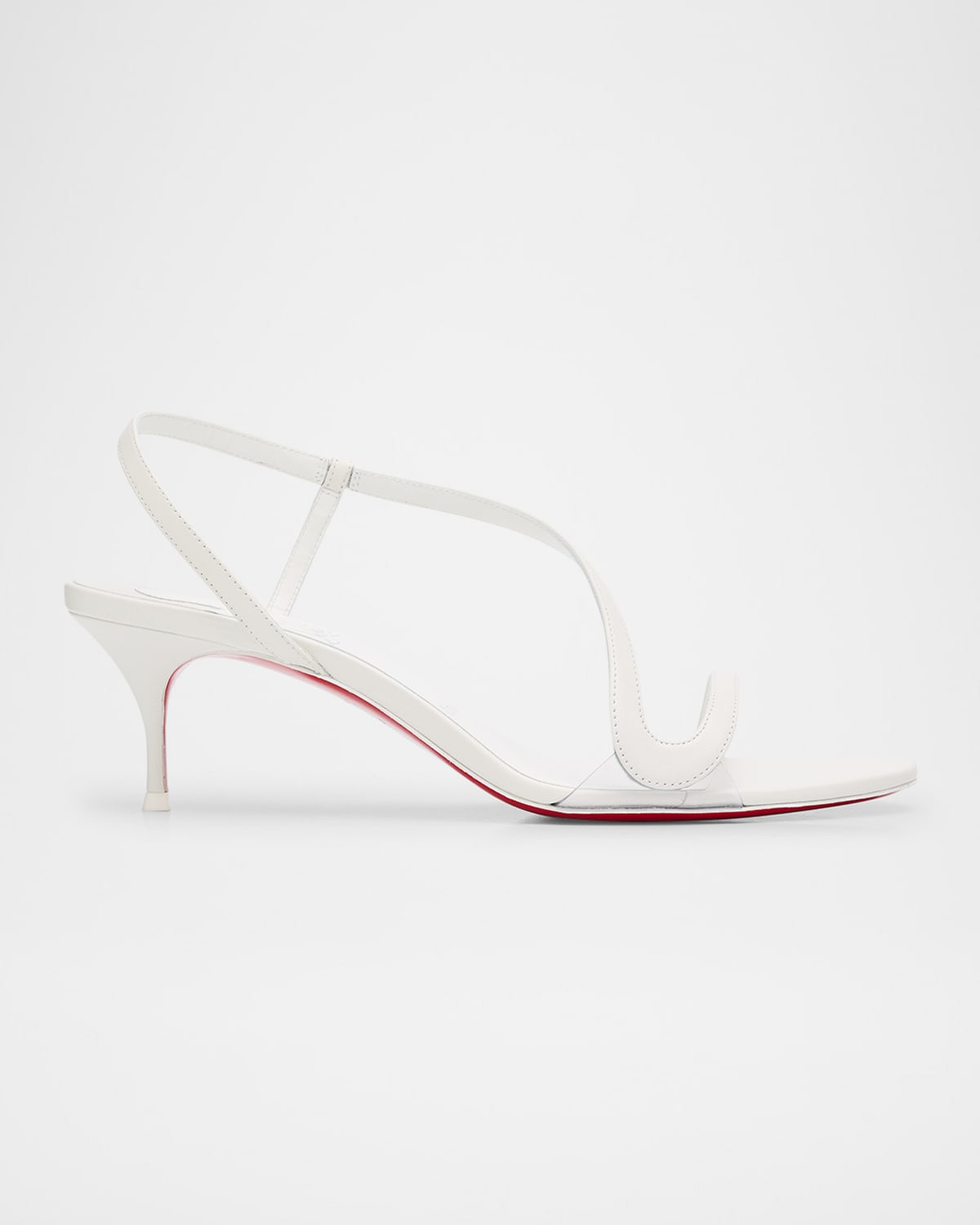 - Christian Louboutin "Rosalie" smooth goatskin leather sandals with clear PVC trim. - 2.25 in / 55 mm kitten heel. - Open toe. - Crossover vamp slingback strap. - Lining: Leather. - Signature Louboutin red leather sole. - Made in Italy.