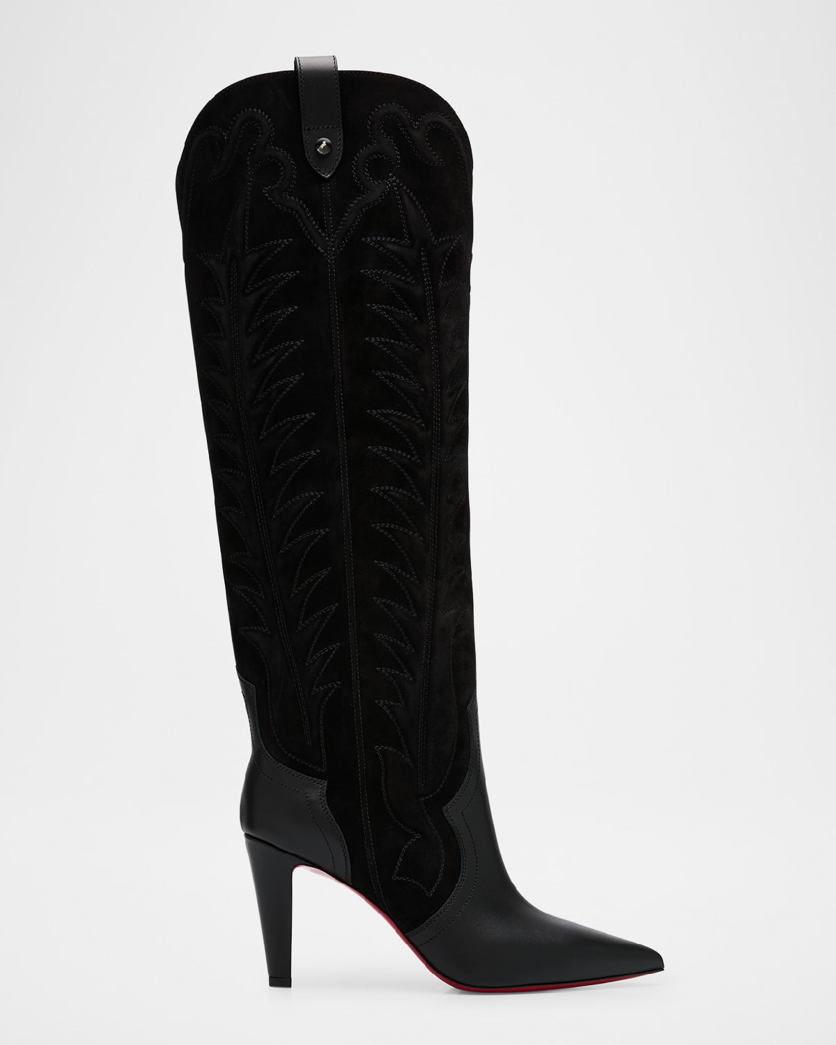 - Christian Louboutin suede and leather knee boots with stitch detailing - 3.25 in / 85 mm stiletto heel - Pointed toe - Curved collar with pull-tabs - Pull-on style - Signature Louboutin red leather outsole - Made in Italy