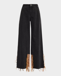 Christopher Esber jeans featuring basketweave leather hem inset with fringe Mid rise sits high on hip Fivepocket style Wide legs Full length Button/zip fly; belt loops Cotton/leather Imported