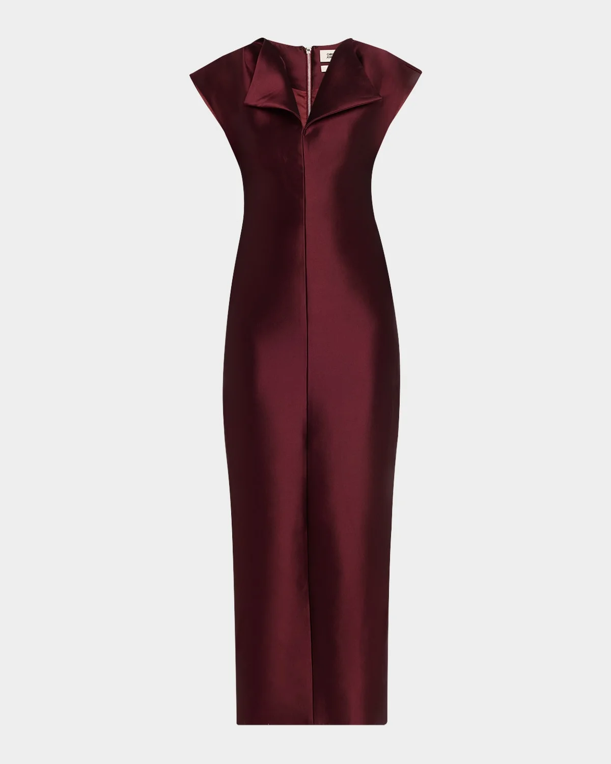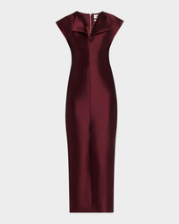CHRISTOPHER JOHN ROGERS dress is crafted from a silkwool satin accented with a peel collar and an exposed back zip V neckline Cap sleeves Sheath silhouette Ankle length Centerback slit hem Zip closure Silk/wool Professional cleaning recommended Made in USA