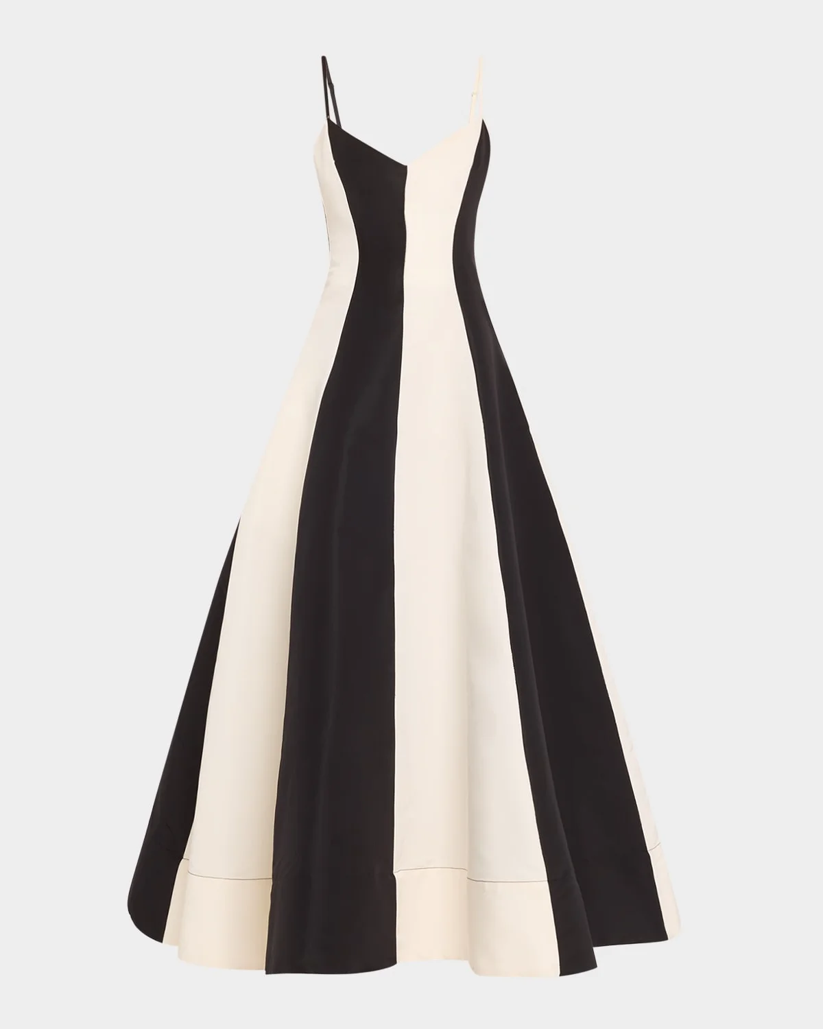 - CHRISTOPHER JOHN ROGERS stripe colorblock evening gown - V neckline - Adjustable shoulder straps - Side slip pockets - Full length - A-line silhouette - Zip closure - Silk - Dry clean, professional cleaning recommended - Made in USA