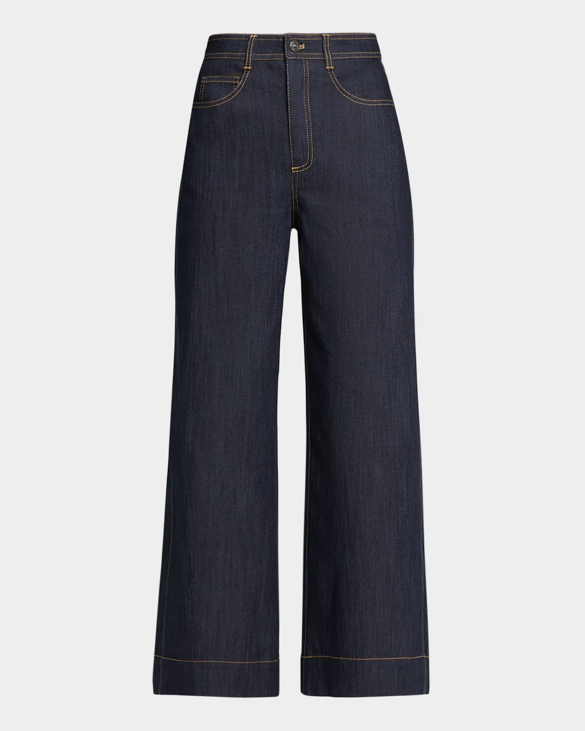 Cinq a Sept "Betsy" denim pants finished with contrast stitching & nbsp; High rise Five-pocket style Wide, tailored legs Ankle length Button/zip fly; belt loops & nbsp; Cotton/polyester/elastane Dry clean & nbsp; Imported