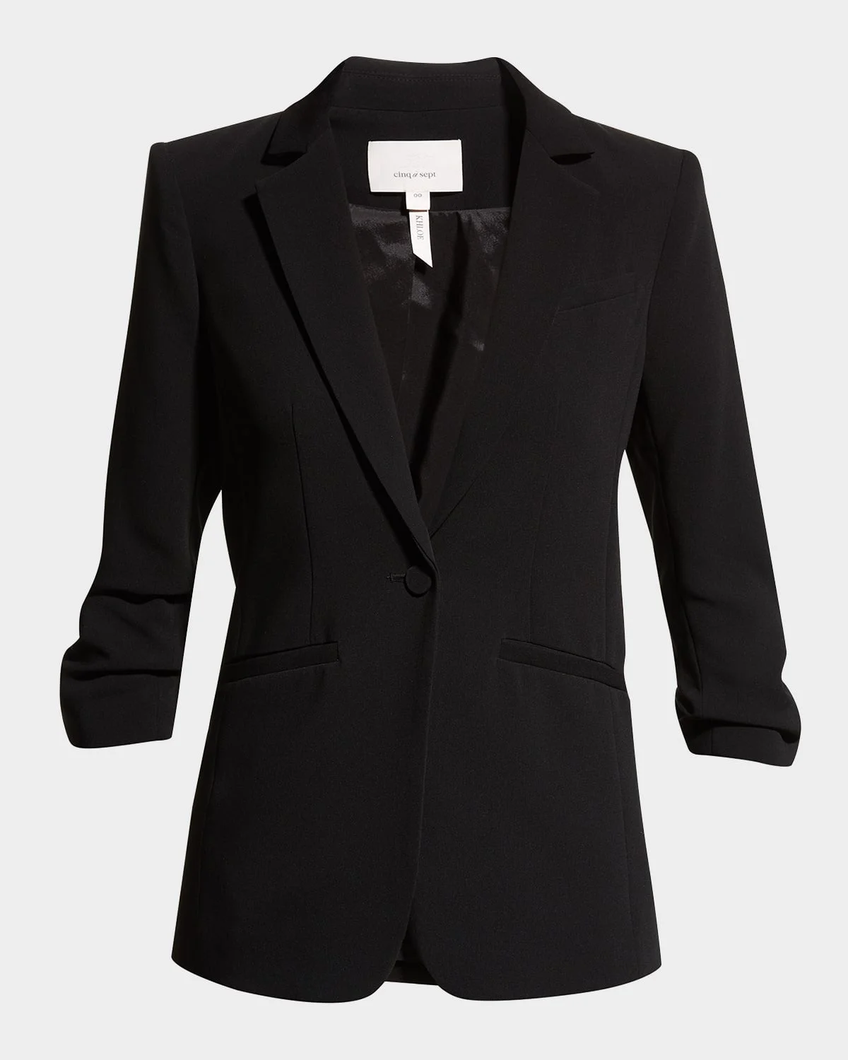 Crafted of supple crepe, Cinq a Sept & apos;s Khloe blazer is designed with softly gathered three-quarter sleeves. Cinq a Sept "Khloe" crepe blazer About 26.25" from shoulder to hem; shoulder width, about 6.5" Notched lapels; single-button front Ruched three-quarter sleeves; approx. 9"L Faux pockets Relaxed silhouette Vented back hem Polyester Dry clean Imported Measurements taken from a US size 8 Model measurements: 5 & apos;0" tall