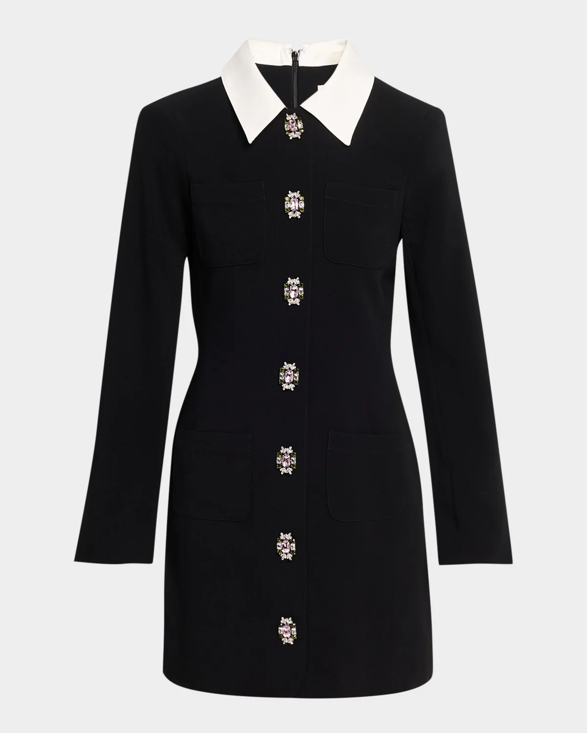 Cinq a Sept "Sheryl" mini dress finished with crystal-embellished buttons & nbsp; Contrast point collar & nbsp; Long sleeves with button cuffs; approx. 32.8"L Chest and hip patch pockets & nbsp; Tailored silhouette Hem falls above the knee Button-front & nbsp; Triacetate/polyester Lining: Polyester Dry clean Imported Model is 5 & apos;10"/177cm.
