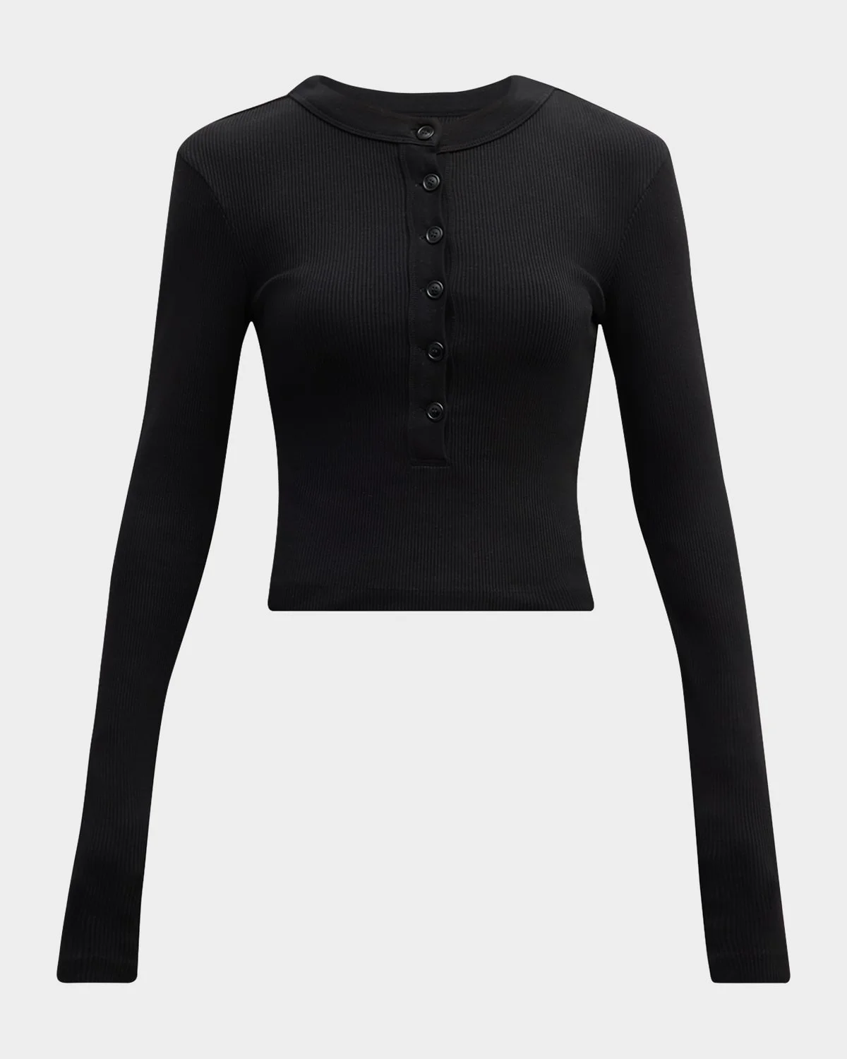 - Citizens of Humanity "Varra" henley top in ribbed knit - Crew neckline; button-placket - Long sleeves - Fitted - Hem sits at the hip - Pullover style - Cotton/Tencel® lyocell/spandex - Made in USA - Model is 5'10"/177cm.