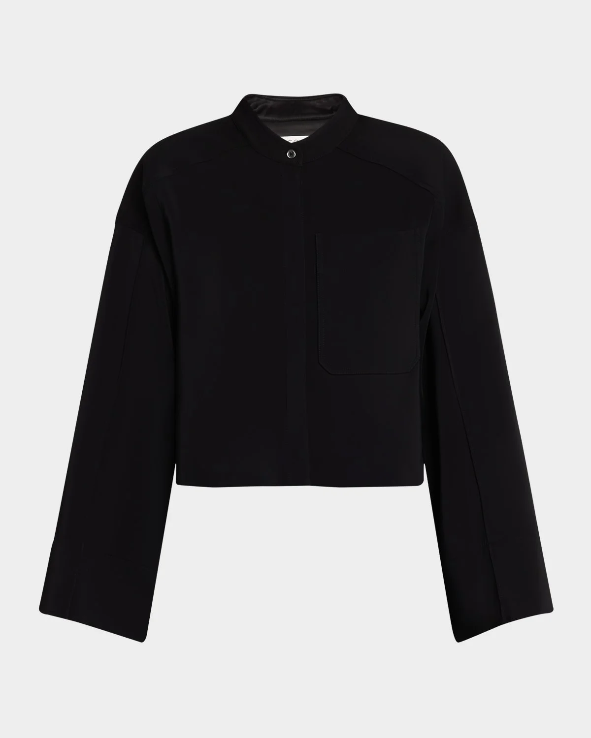 - Co shirt featuring bell sleeves and a chest patch pocket - Band collar; concealed button front - Long flare sleeves - Boxy fit - Hip length - Viscose/elastane - Imported