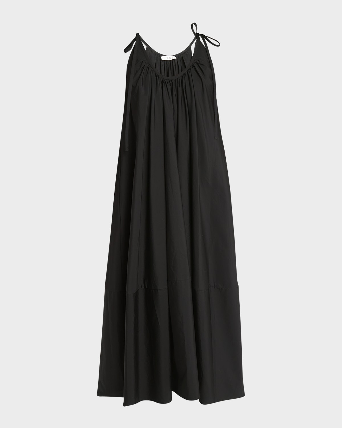 Co dress featuring a gathered neckline and tie shoulder straps Scoop neckline Sleeveless Side split pockets Shift silhouette Full length Slipover style Cotton Imported