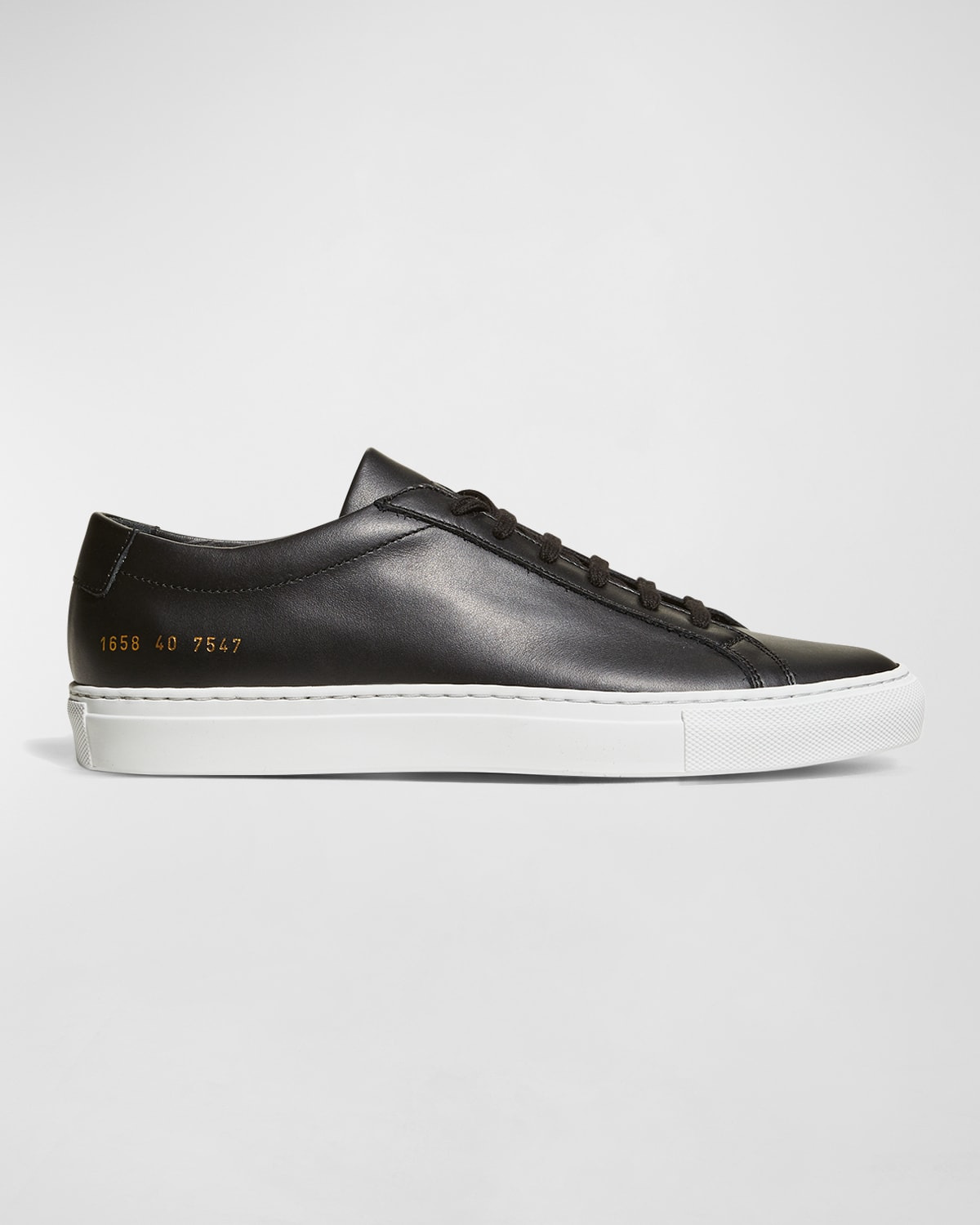 Common Projects "Achilles" sneakers in smooth leather. True to size. 1" platform heel. Flat heel. Round toe. Laceup vamp. Serial number print at sides. Rubber sole. Made in Italy.