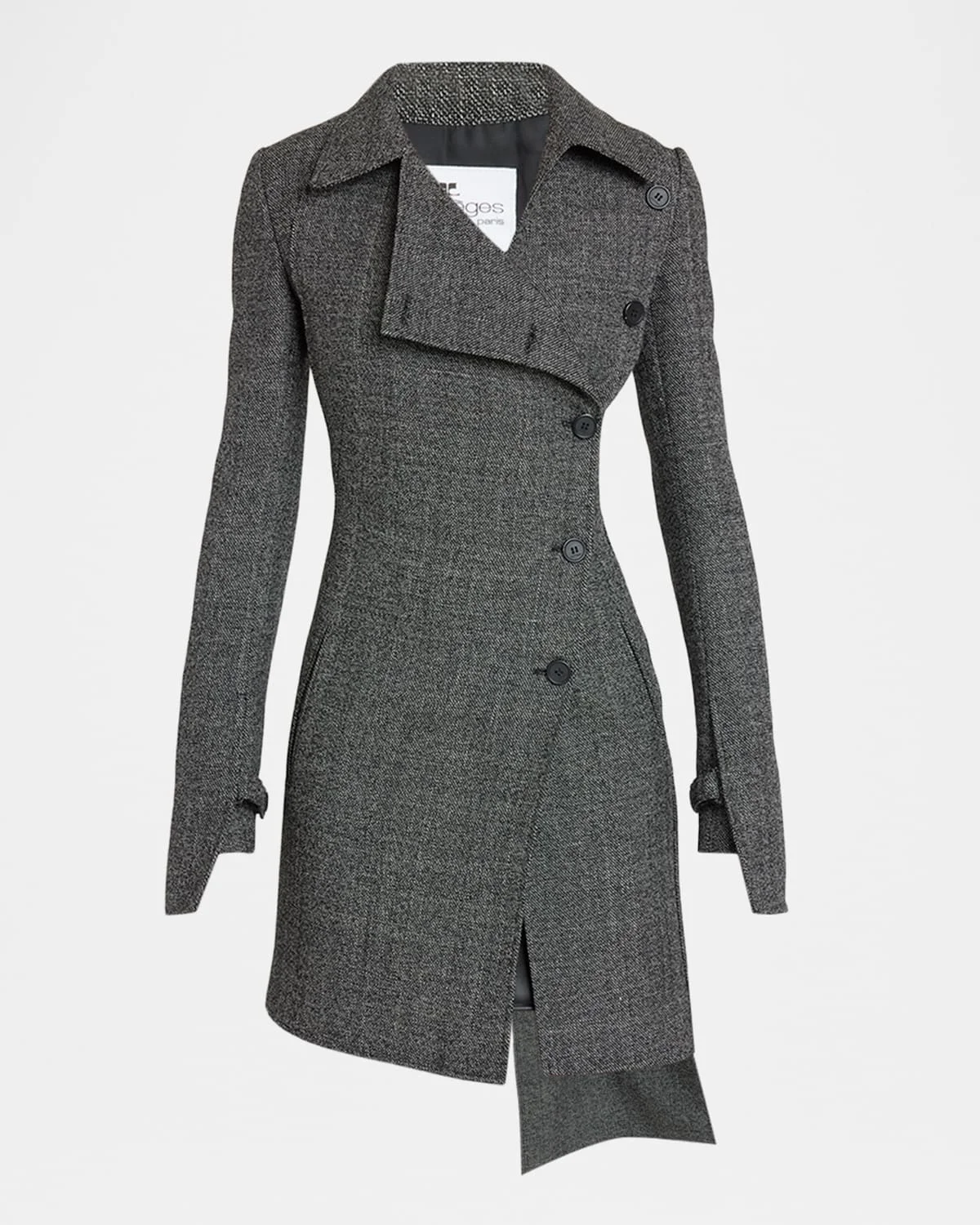 Courreges peacoat is tailored in a caviar wool featuring an abstract side panel and slits Notch lapels; doublebreasted front Long sleeves; buttontab stepped cuffs Padded shoulders Hip welt pockets Slim fit Hem falls below the hip Buttontab back detail Wool Imported