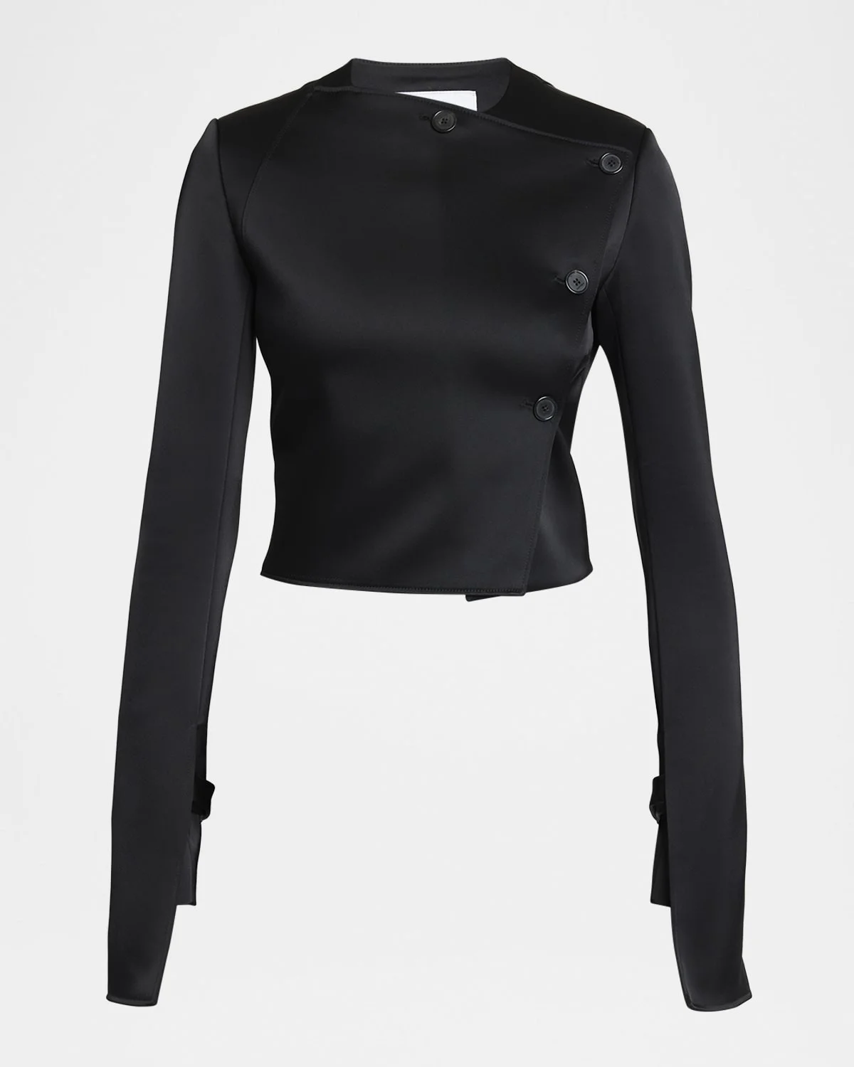 Courreges jacket is tailored in a shiny polywool featuring an asymmetric buttoned front High neckline; doublebreasted front Long sleeves; buttontab stepped cuffs Slim fit Cropped length Buttoned closure Polyester/wool/elastane Imported