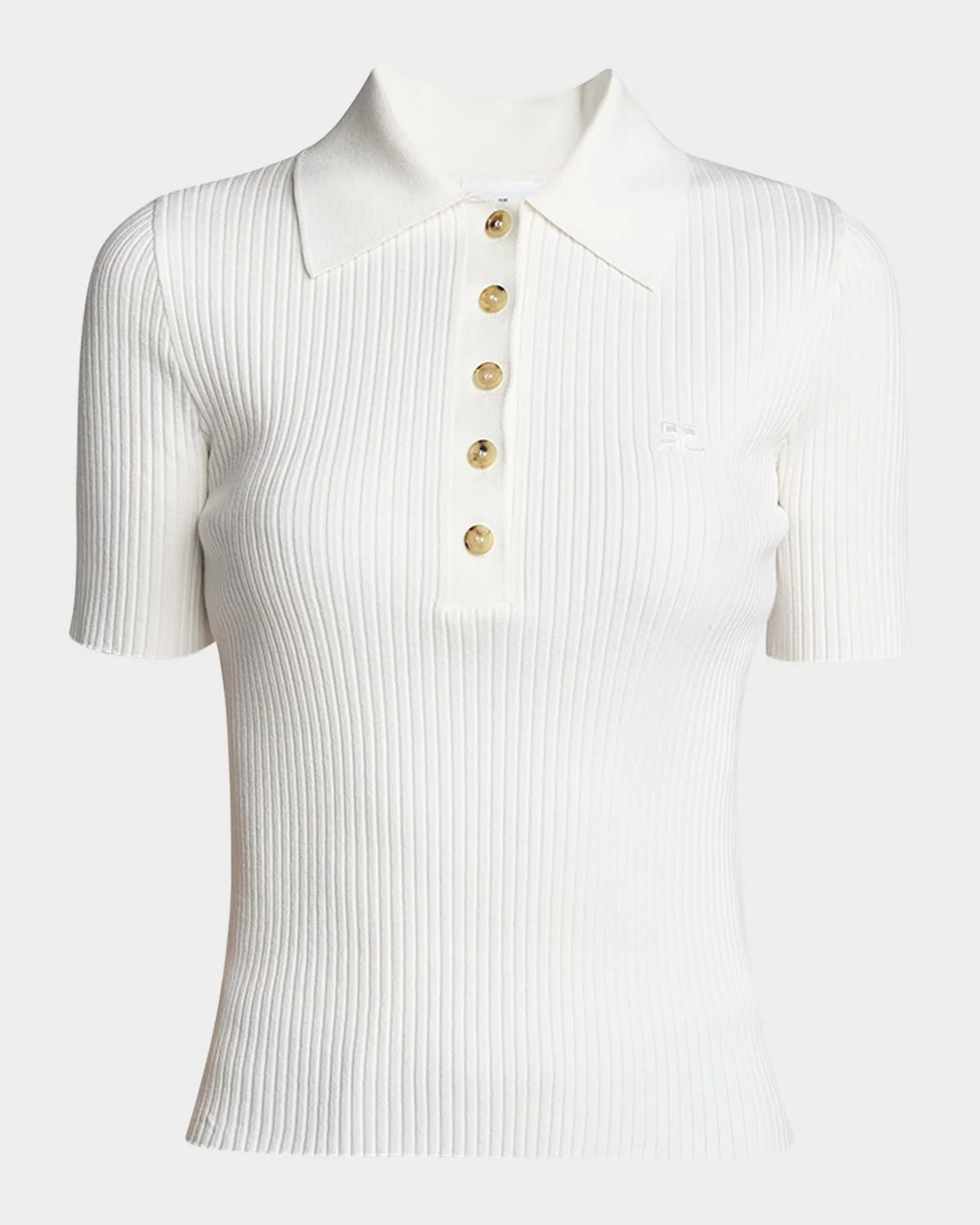 Courreges collared rib-knit polo top features logo embroidery at the front & nbsp; Spread collar Short sleeves Hip length & nbsp; Fitted & nbsp; Viscose/polyester Made in Bulgaria Model is 5 & apos;10"/177cm.