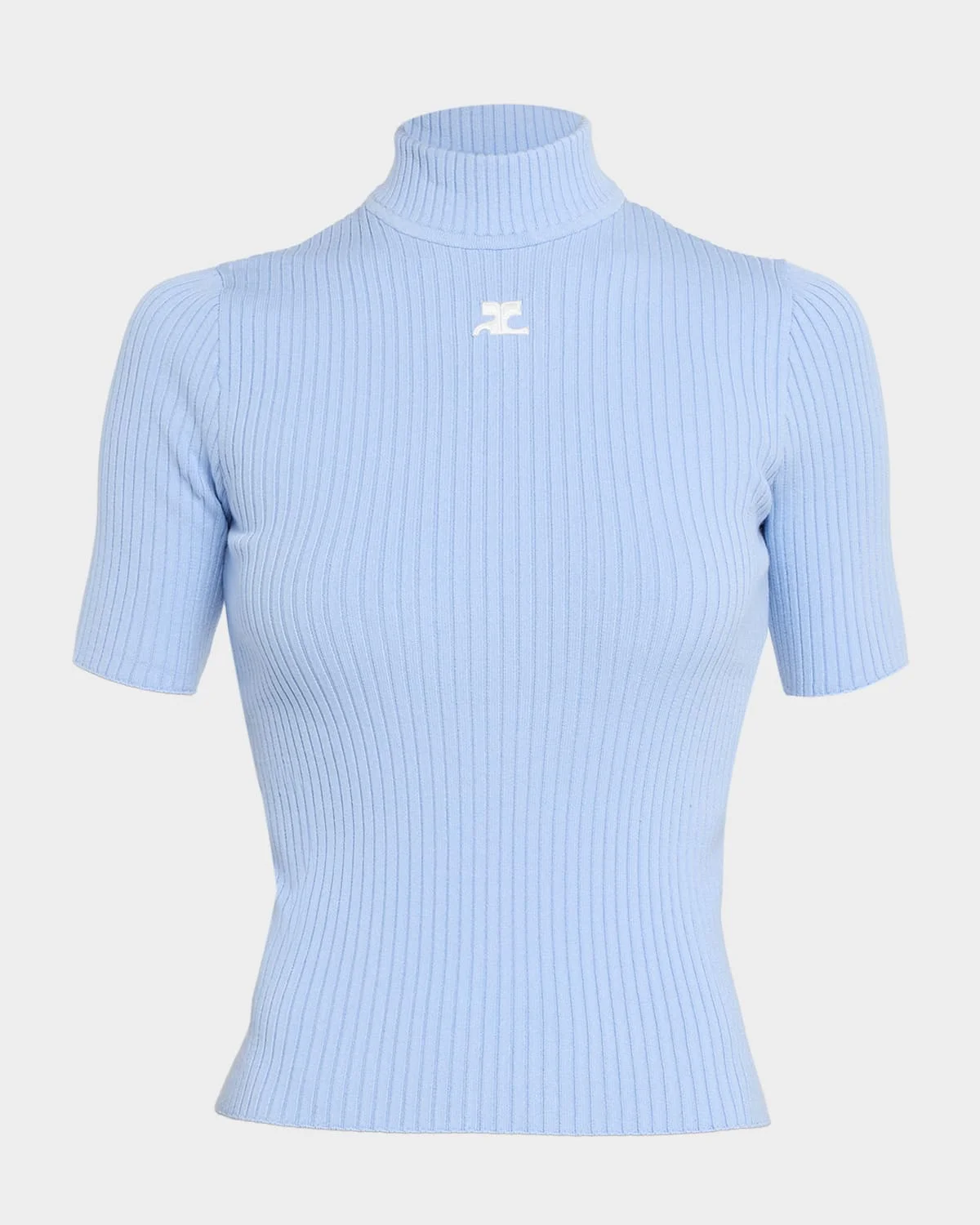 Courreges ribbed knit sweater features logo embroidered front Mock neckline Short sleeves Fitted Pullover style Viscose Imported