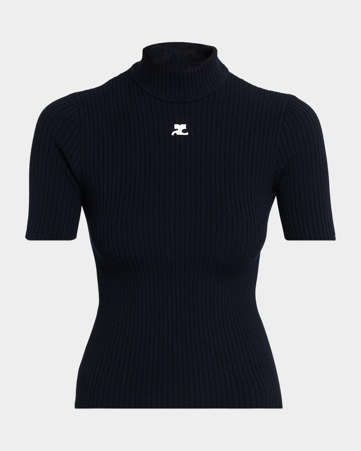 Courreges ribbed knit sweater features logo embroidered front Mock neckline Short sleeves Fitted Pullover style Viscose Imported