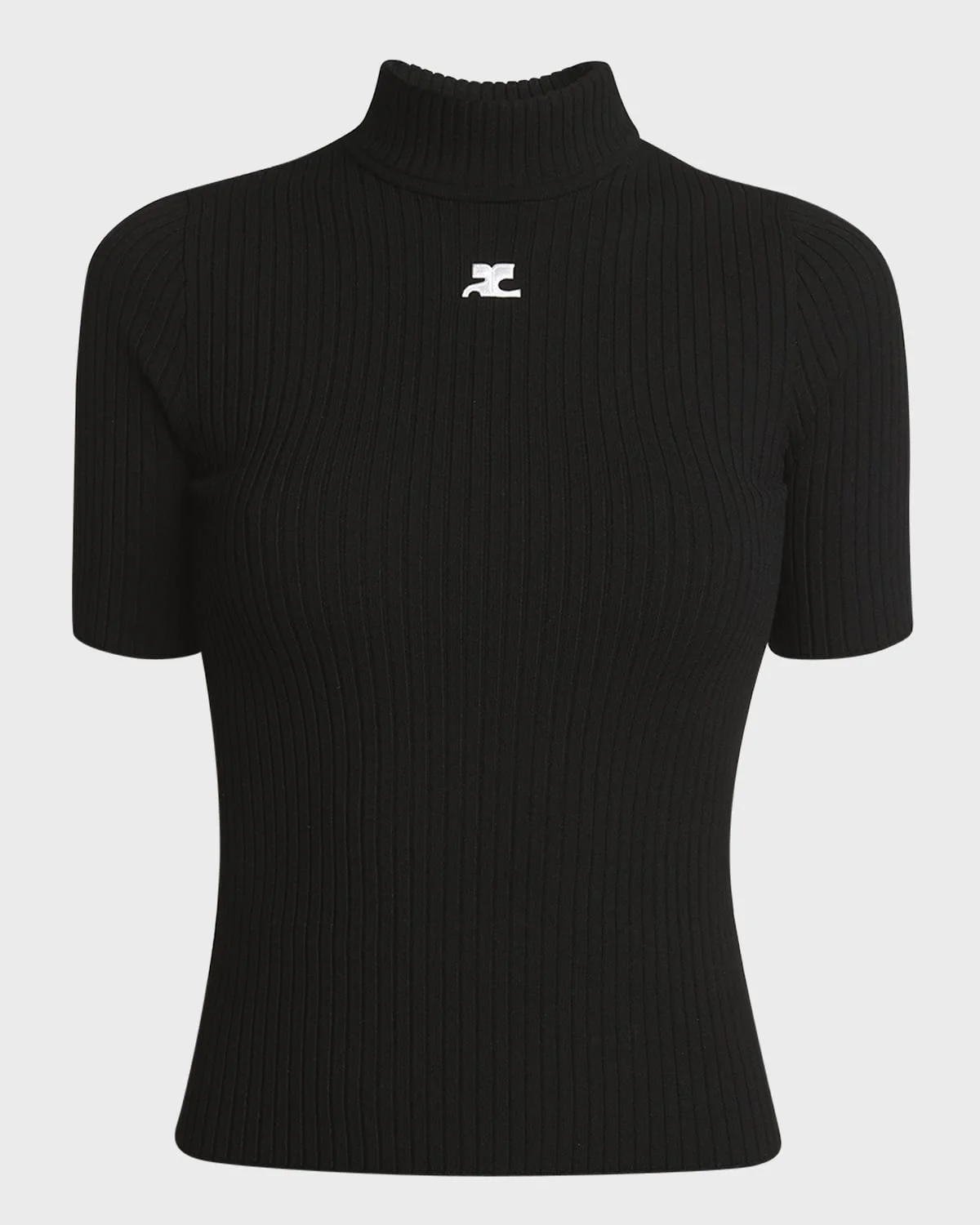 - Courreges ribbed knit sweater features logo embroidered front - Mock neckline - Short sleeves - Fitted - Pullover style - Viscose - Imported - Model is 5'10"/177cm.