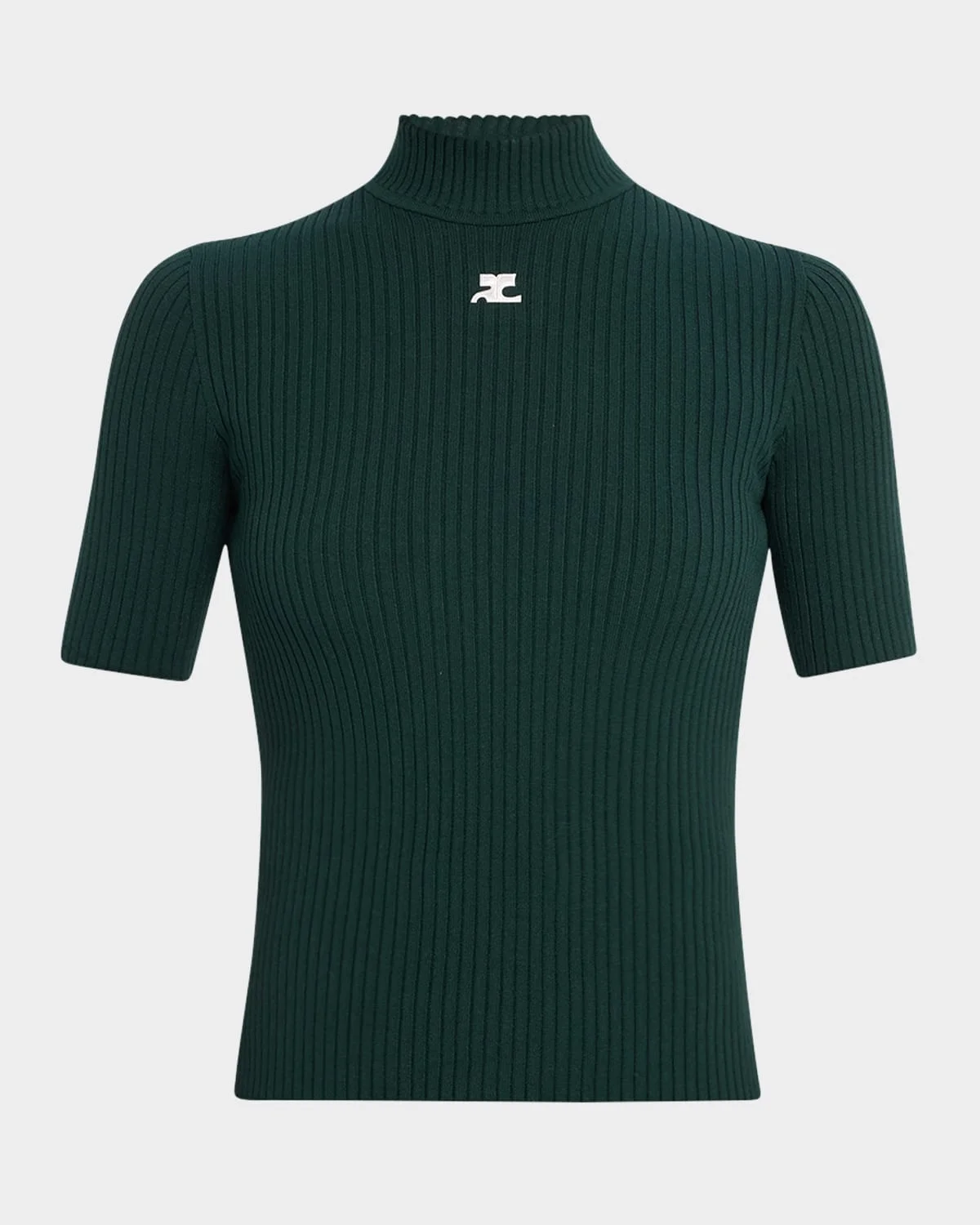 Courreges ribbed knit sweater features logo embroidered front Mock neckline Short sleeves Fitted Pullover style Viscose Imported