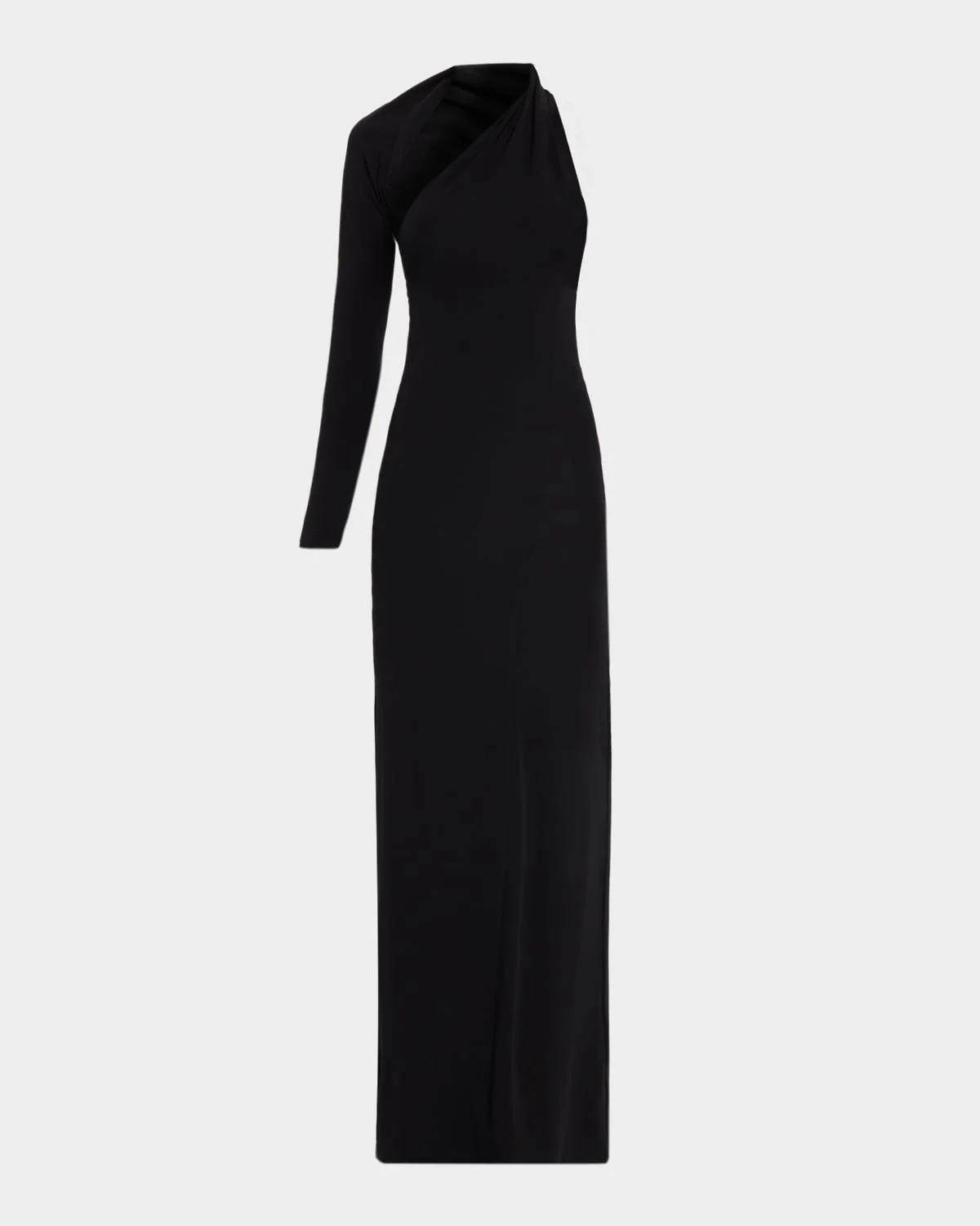 Crafted from stretch crepe, this fulllength dress by Courreges features a unique asymmetric design Oneshoulder neckline Long sleeves Centercut back vent Full length Bodyskimming silhouette Slipover style Viscose/elastane Made in Portugal