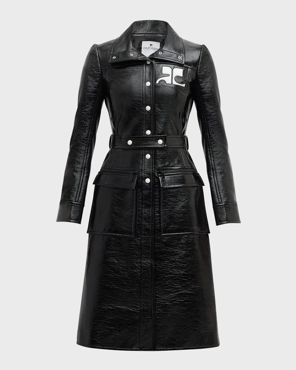 - Courreges Reedition vinyl trench coat featuring contrast logo chest and self-belt - Spread collar; snap front - Long sleeves; snap cuffs - Side flap pockets - Belted waist - A-line silhouette - Knee length - Center-back vented hem - Cotton/polyurethane/elastane - Lining: Cupro - Made in Portugal - Model is 5'10"/177cm.