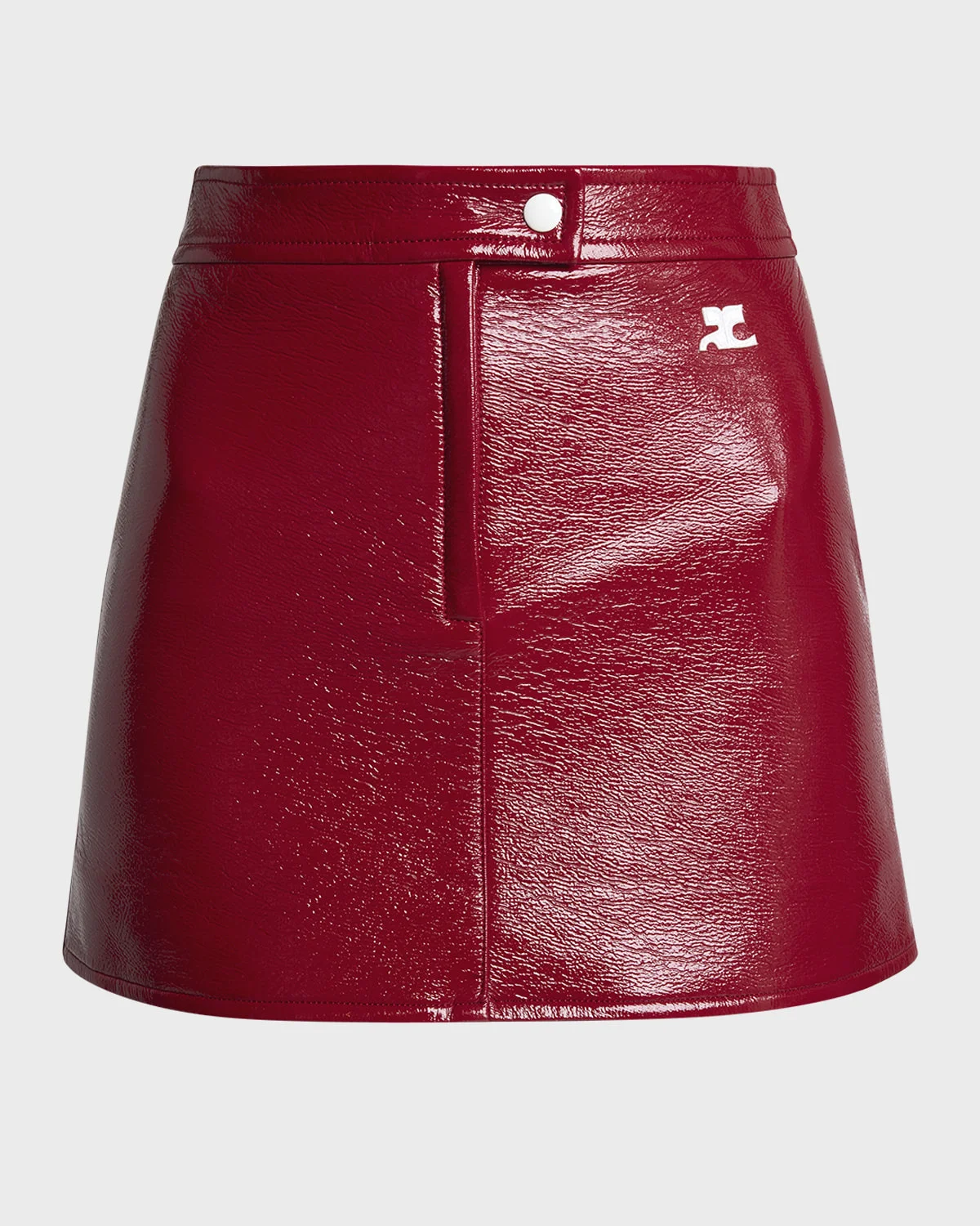 - Courreges "Reedition" vinyl skirt featuring logo embroidered side - High waist - A-line silhouette - Mini length - Snap-tab/zip fly - Cotton/polyurethane/elastane - Lining: Cupro - Imported - Model is 5'10"/177cm.