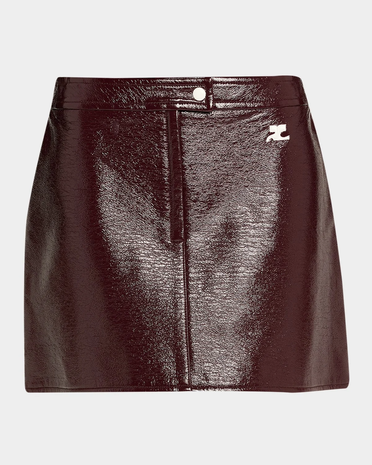 Courreges "Reedition" vinyl skirt featuring logo embroidered side High waist Aline silhouette Mini length Snaptab/zip fly Cotton/polyurethane/elastane Lining: Cupro Imported