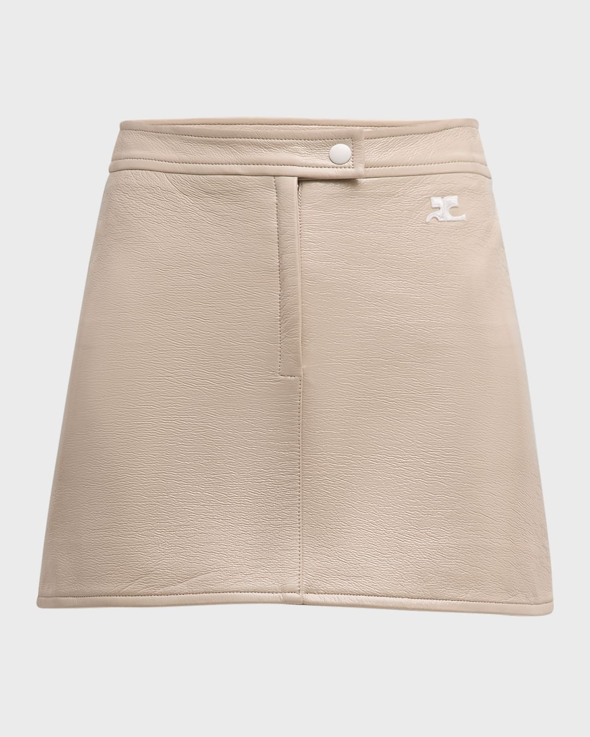 - Courreges "Reedition" vinyl skirt featuring logo embroidered side - High waist - A-line silhouette - Mini length - Snap-tab/zip fly - Cotton/polyurethane/elastane - Lining: Cupro - Imported - Model is 5'10"/177cm.