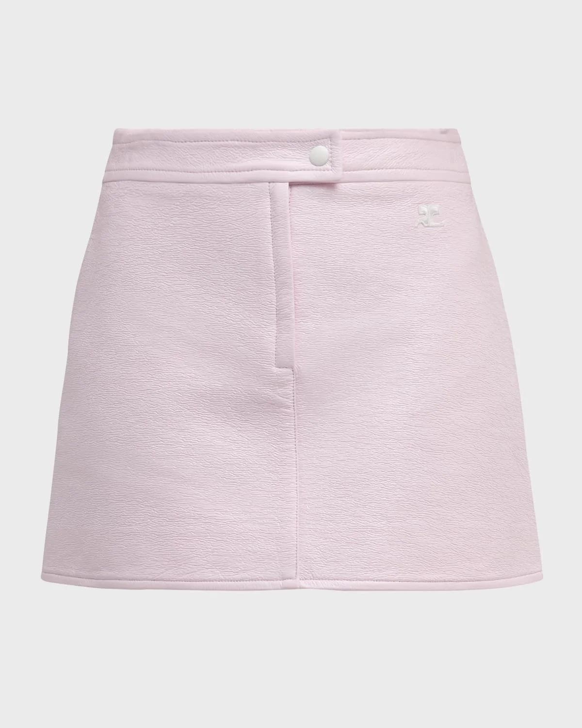 - Courreges "Reedition" vinyl skirt featuring logo embroidered side - High waist - A-line silhouette - Mini length - Snap-tab/zip fly - Cotton/polyurethane/elastane - Lining: Cupro - Imported - Model is 5'10"/177cm.