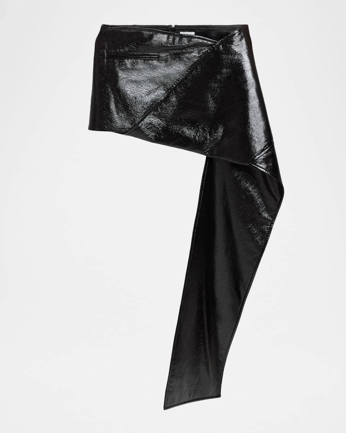 Courreges skirt is crafted of a shiny vinyl featuring a sidedraped panel Low waist Hip welt pocket Skirt falls straight from hip to hem Mini length Back zip Cotton/polyurethane/elastane Made in Romania