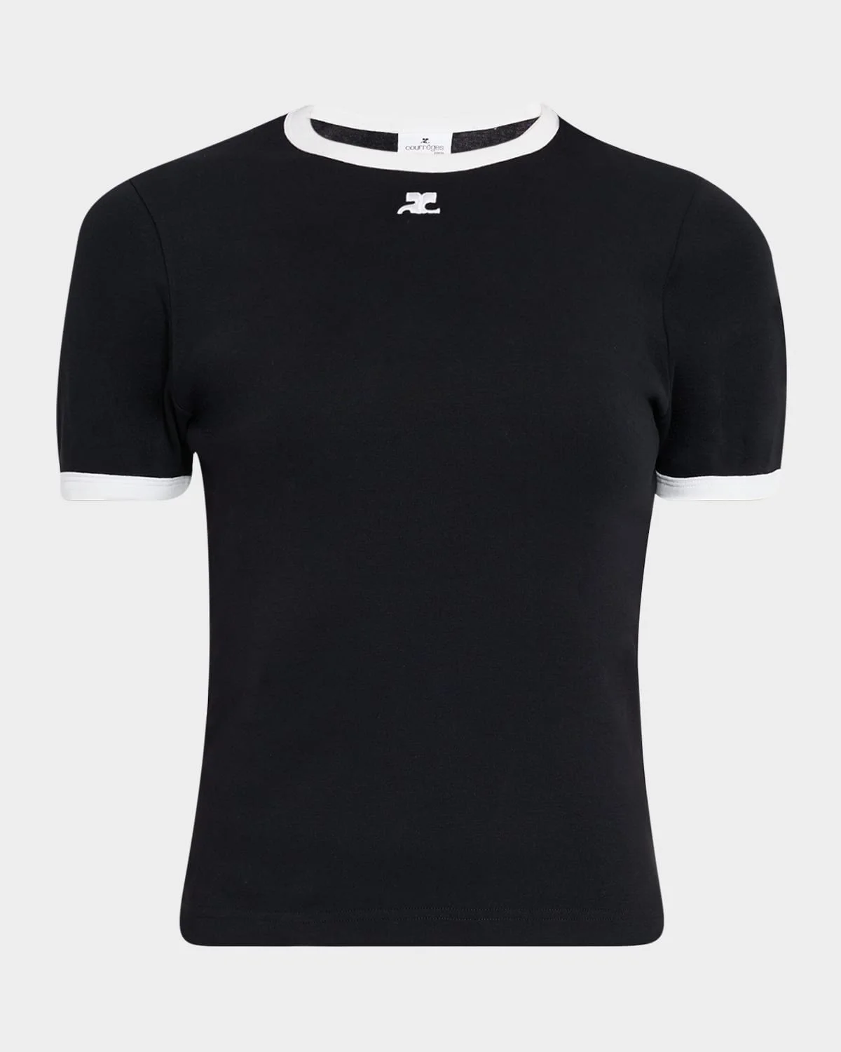 Courreges T-shirt featuring logo embroidered front and contrast trim Crew neckline Short sleeves Slim fit Pullover style Cotton Made in Portugal Model is 5 & apos;10"/177cm.